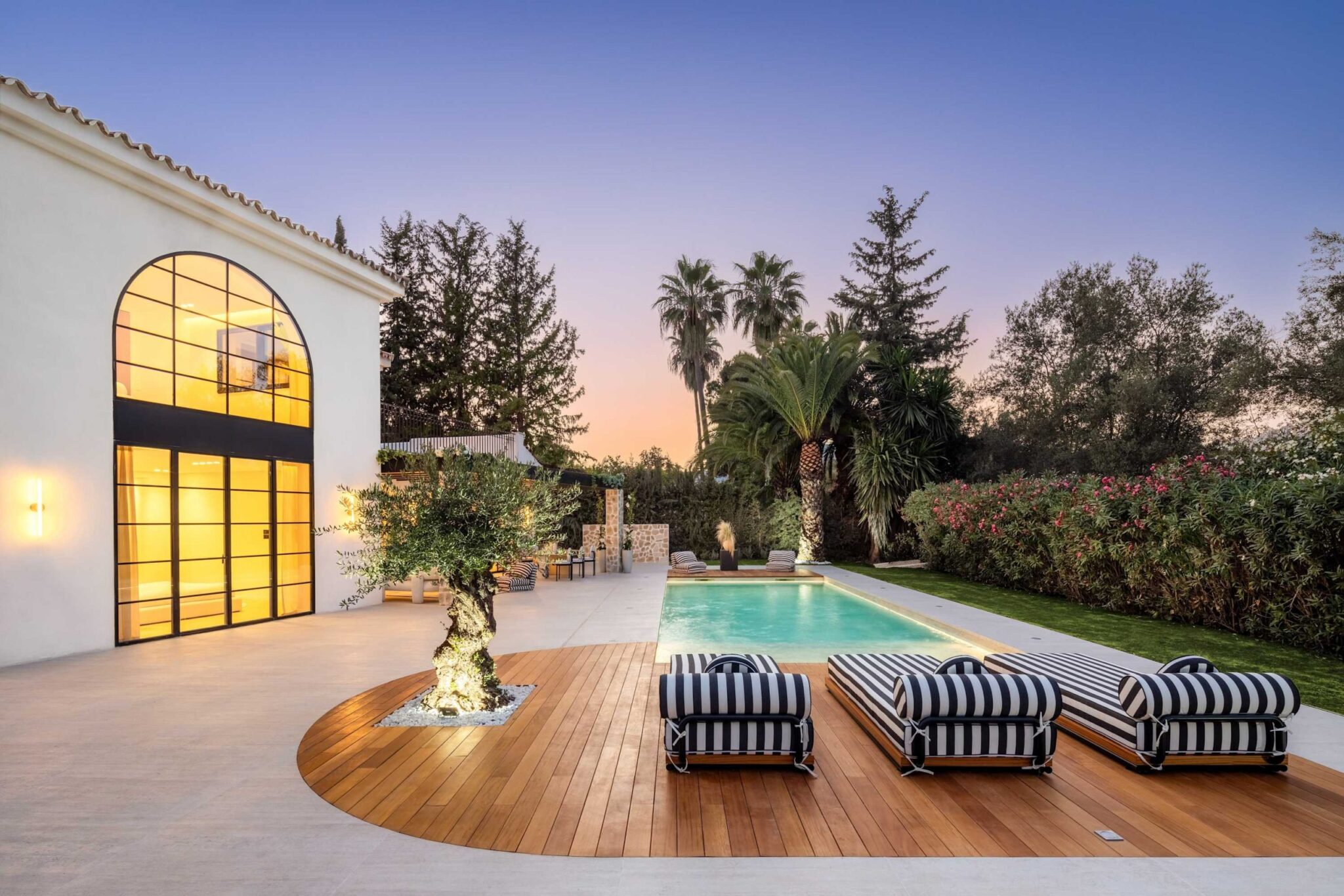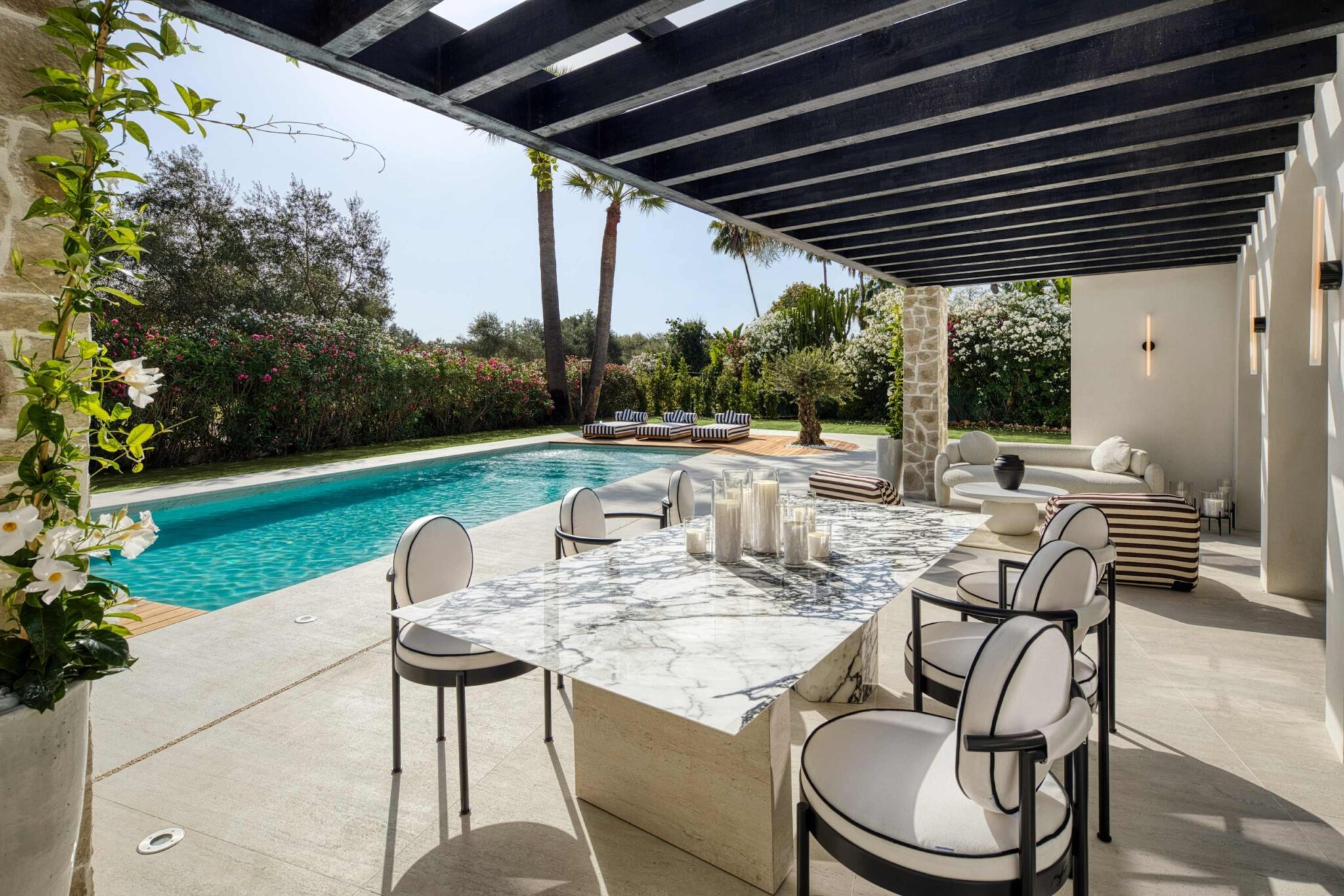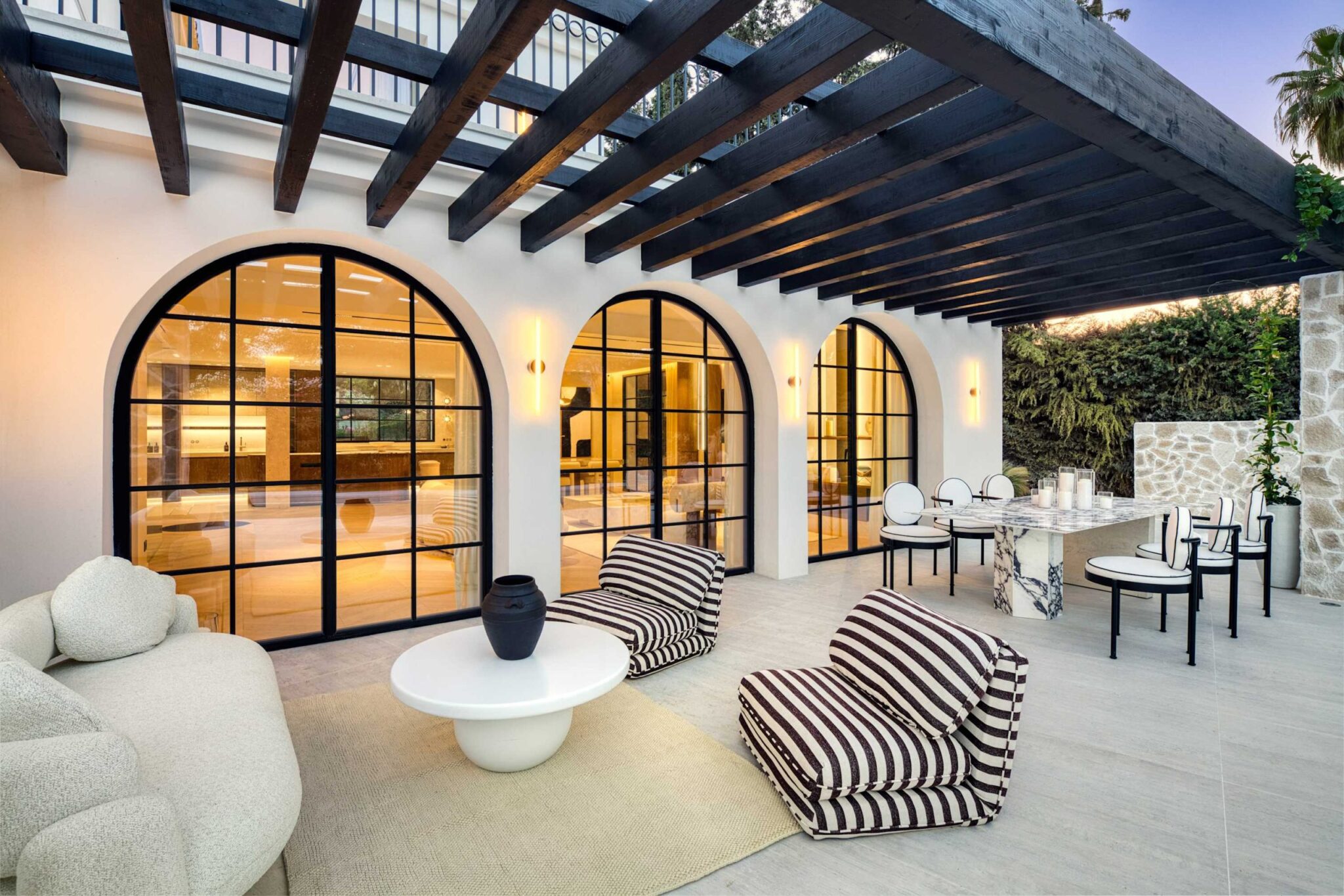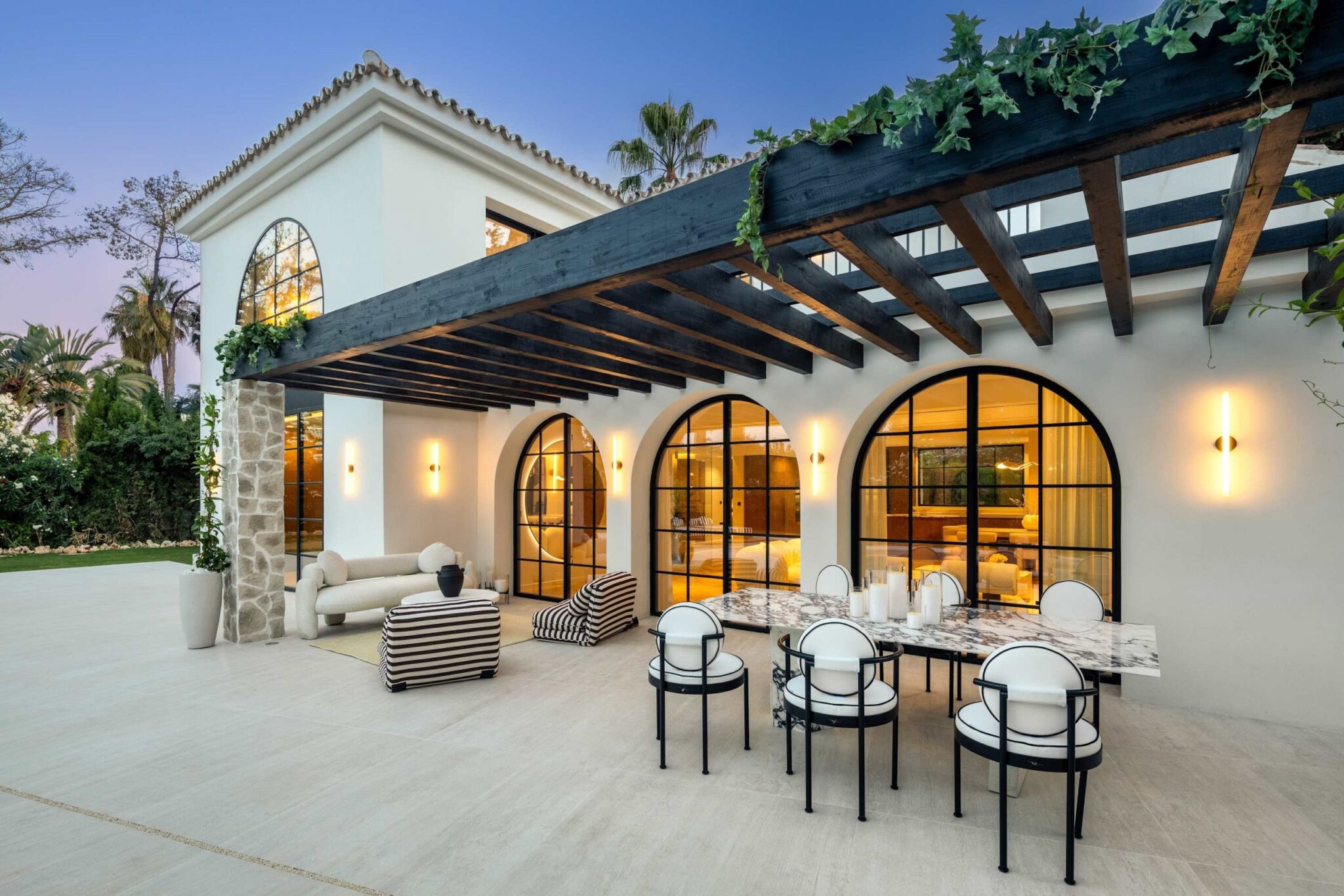 The open-plan living area flows seamlessly into the beautifully landscaped garden, framed by charming arched masonry. A private pool, outdoor dining area, and stylish modern furniture are complemented by intelligent lighting, creating the perfect setting for relaxation or entertaining while enjoying the breathtaking views.
