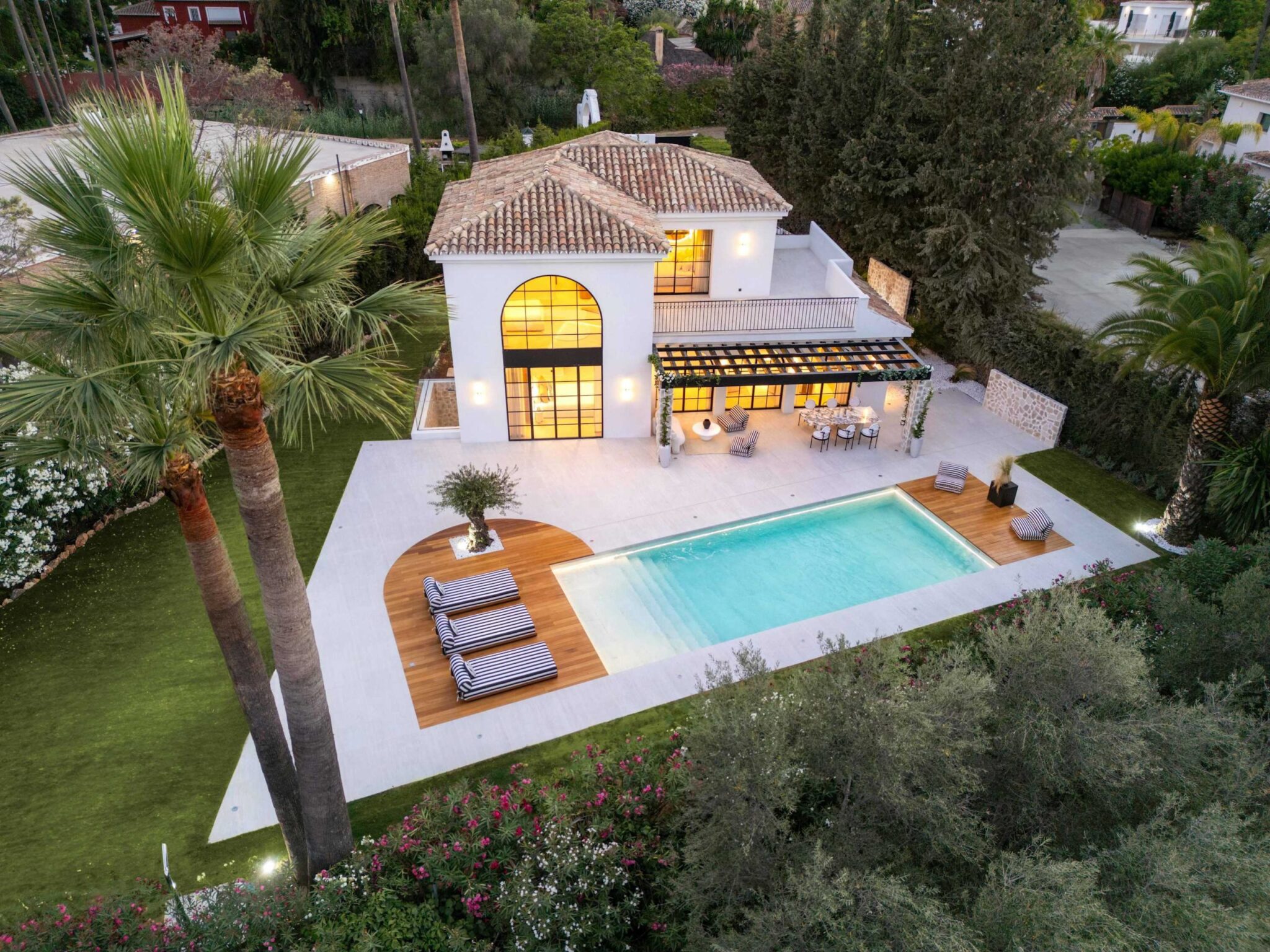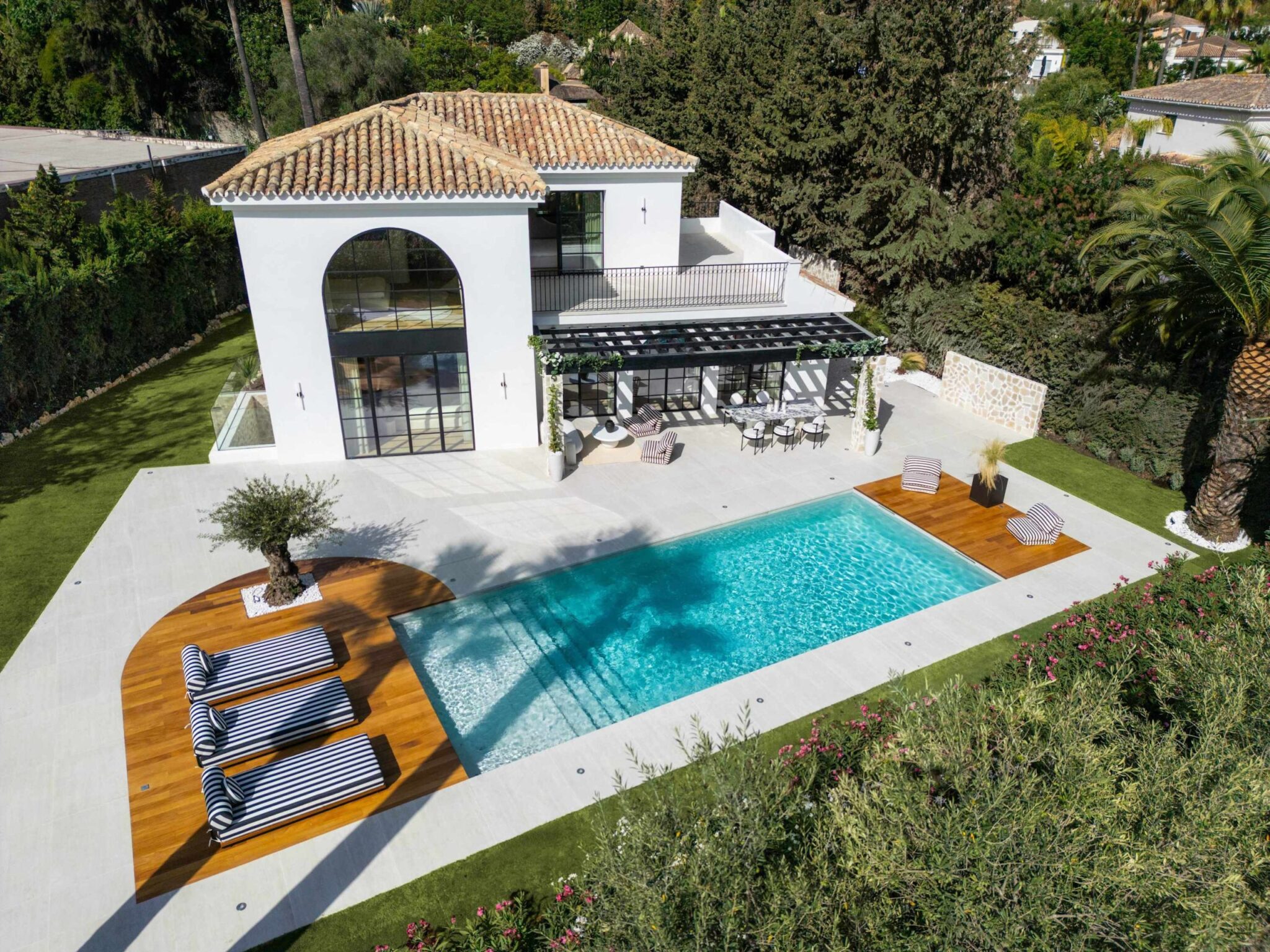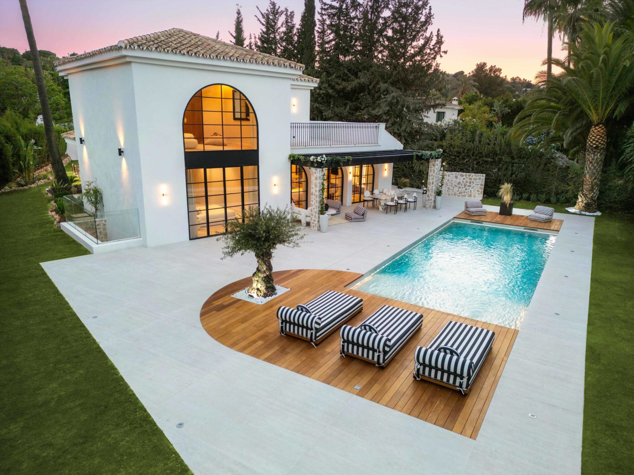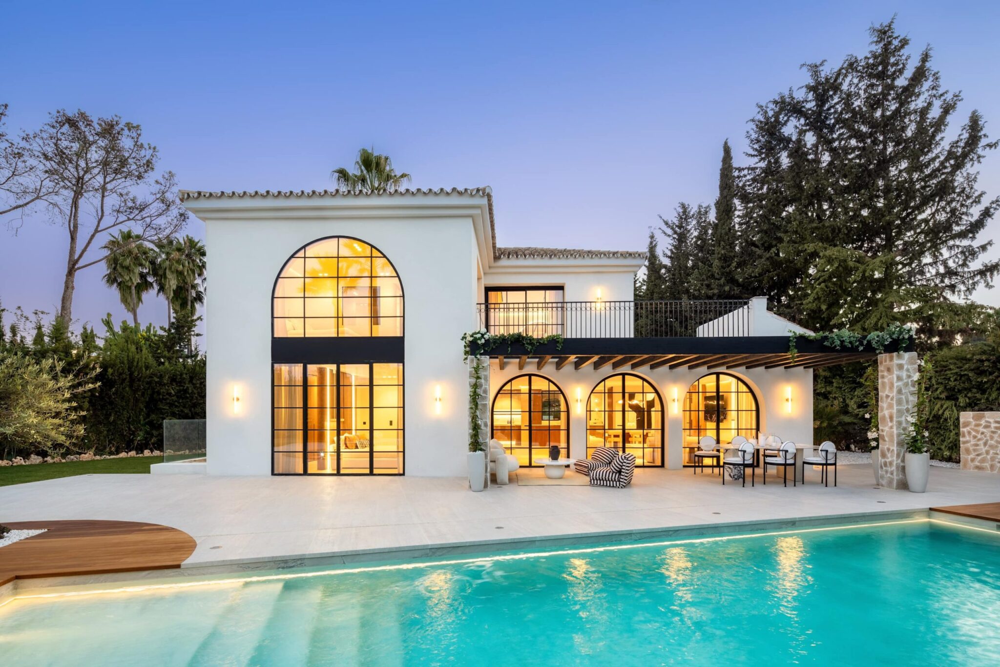 The open-plan living area flows seamlessly into the beautifully landscaped garden, framed by charming arched masonry. A private pool, outdoor dining area, and stylish modern furniture are complemented by intelligent lighting, creating the perfect setting for relaxation or entertaining while enjoying the breathtaking views.
