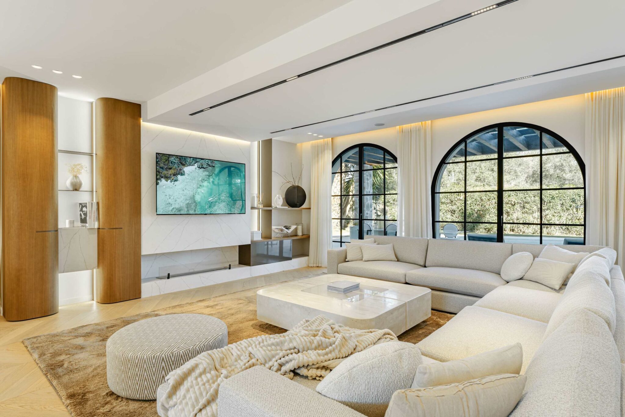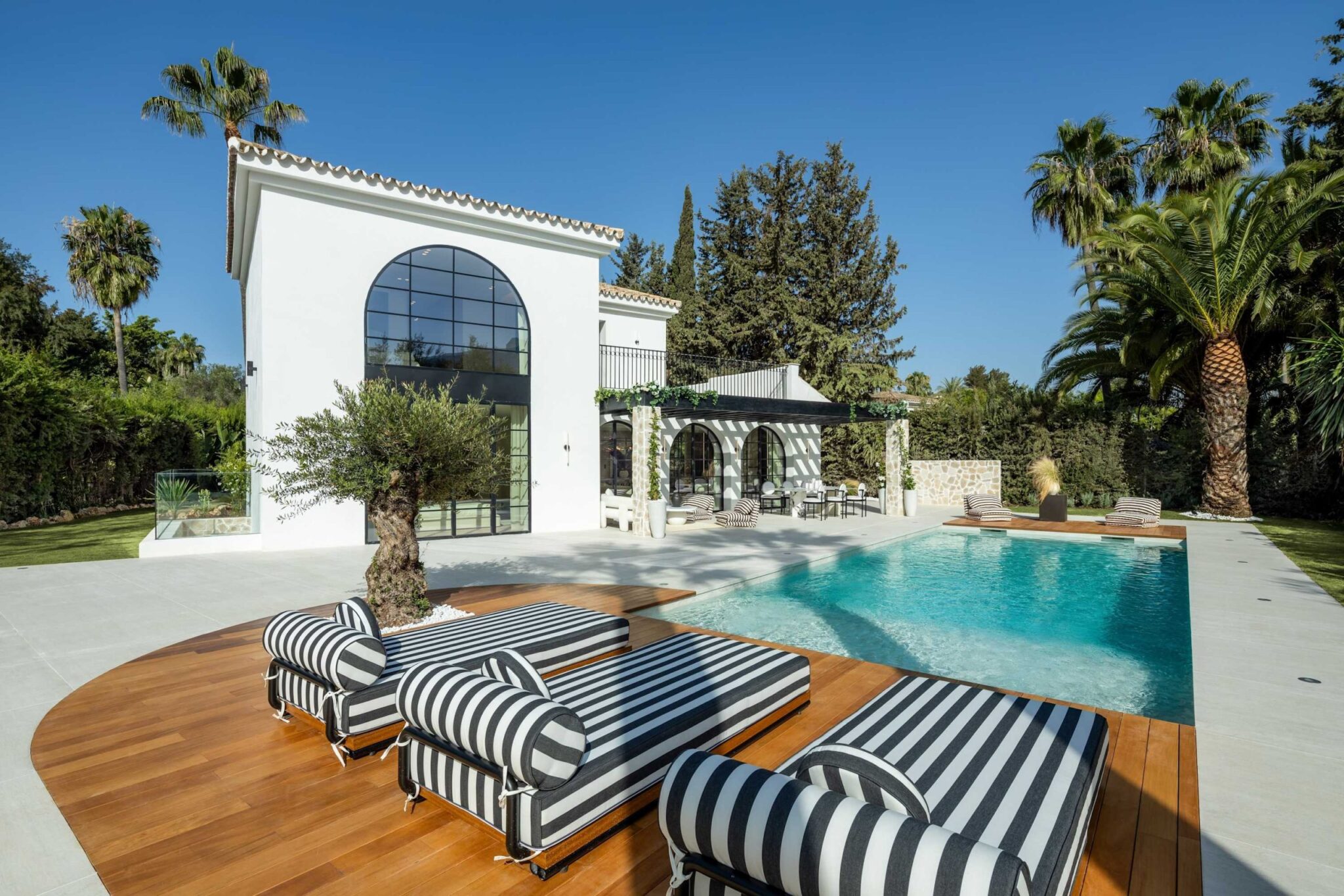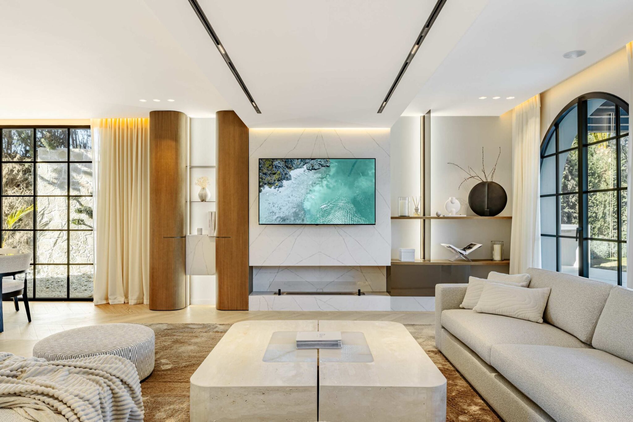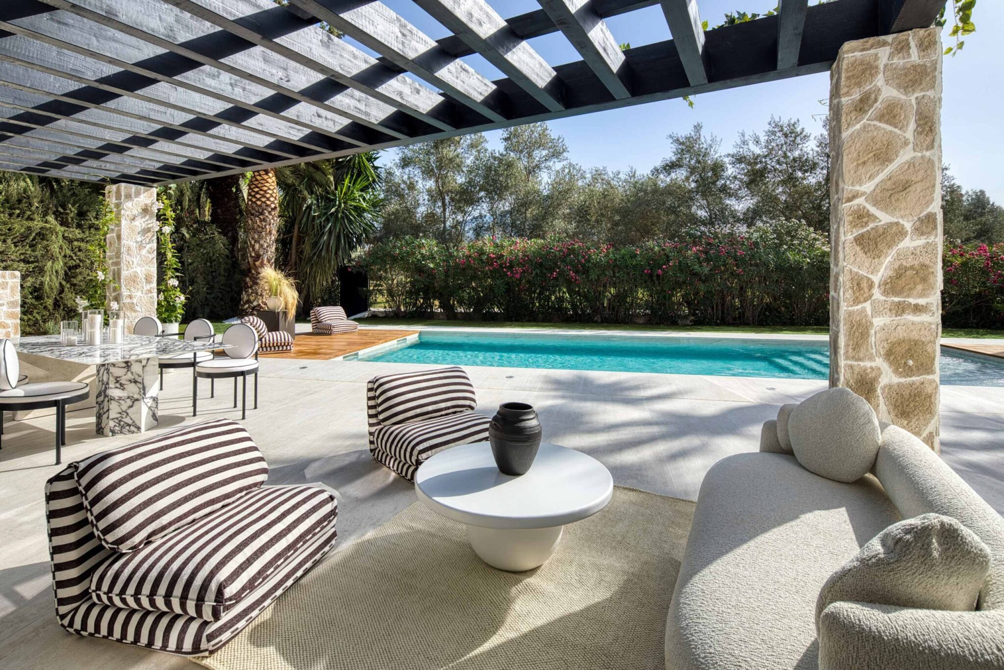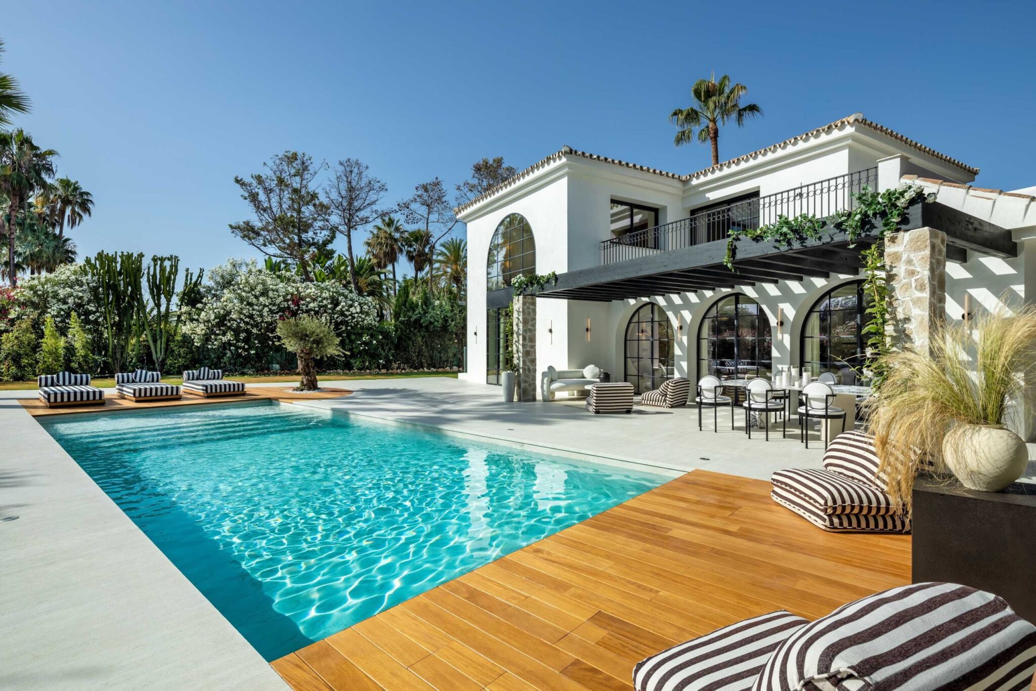 The open-plan living area flows seamlessly into the beautifully landscaped garden, framed by charming arched masonry. A private pool, outdoor dining area, and stylish modern furniture are complemented by intelligent lighting, creating the perfect setting for relaxation or entertaining while enjoying the breathtaking views.