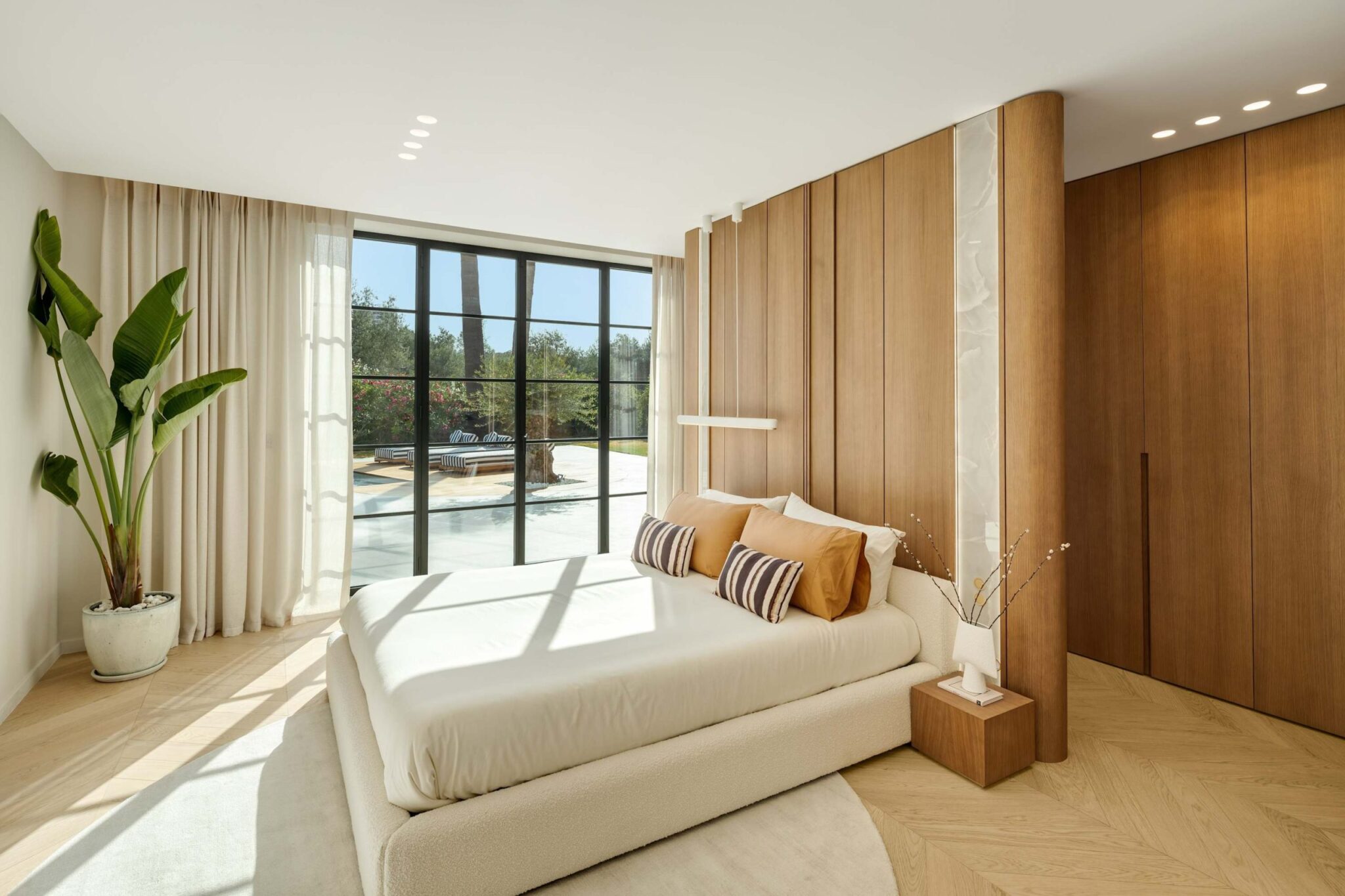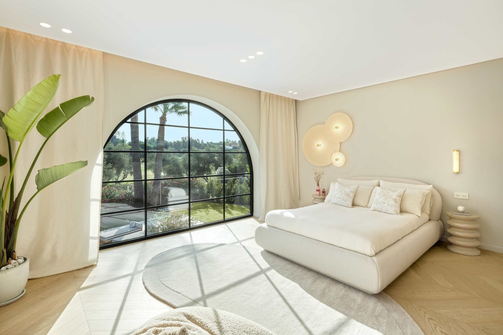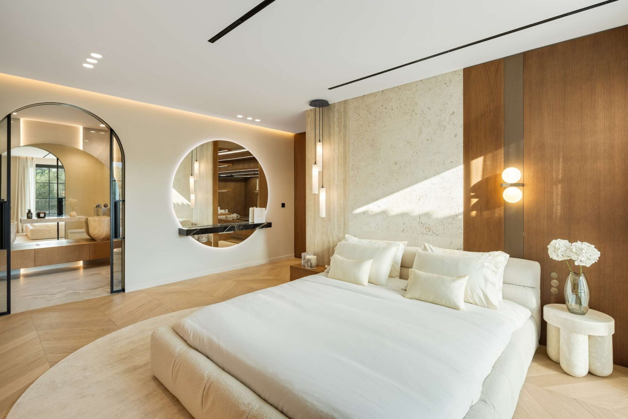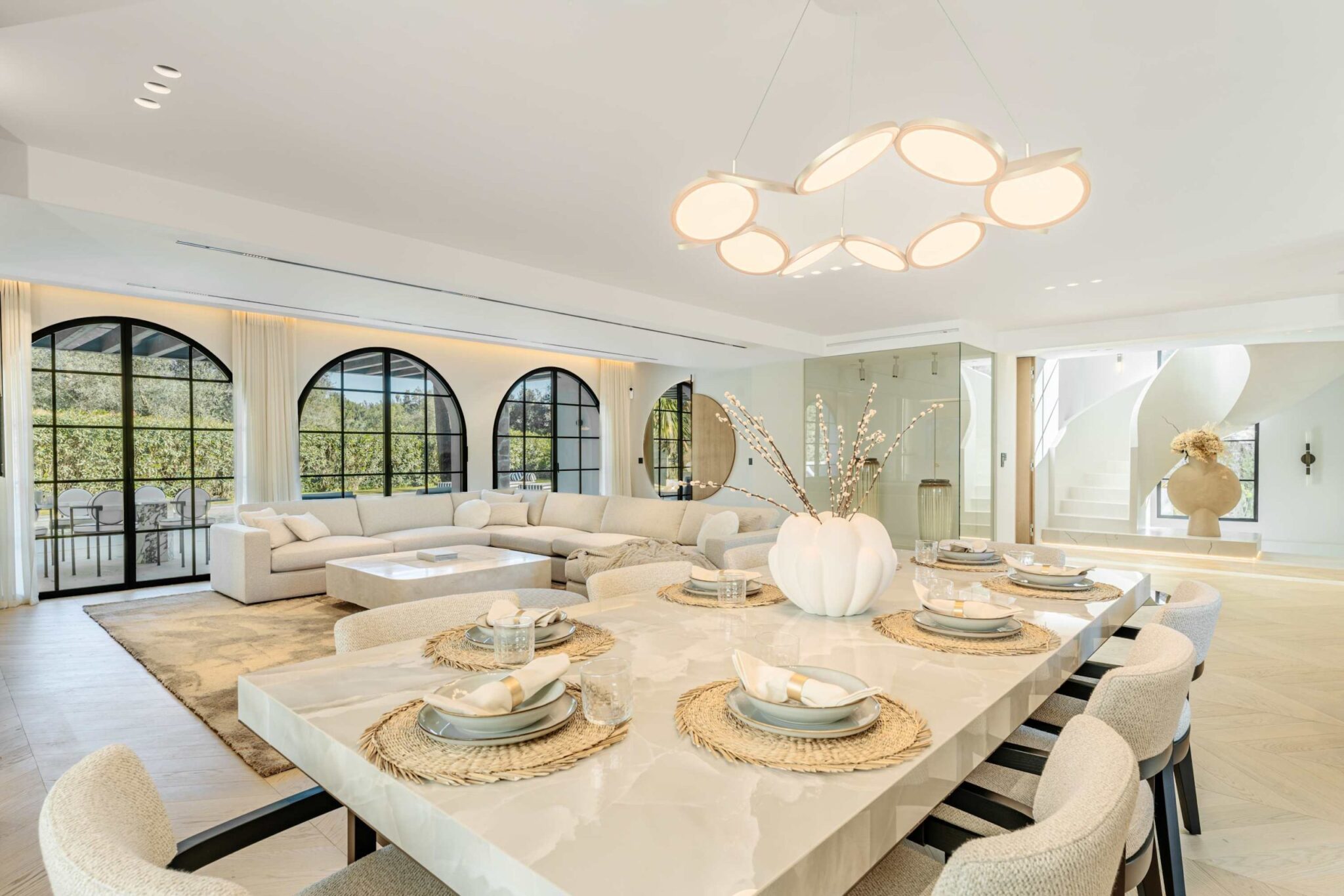 The open-plan living area flows seamlessly into the beautifully landscaped garden, framed by charming arched masonry. A private pool, outdoor dining area, and stylish modern furniture are complemented by intelligent lighting, creating the perfect setting for relaxation or entertaining while enjoying the breathtaking views.