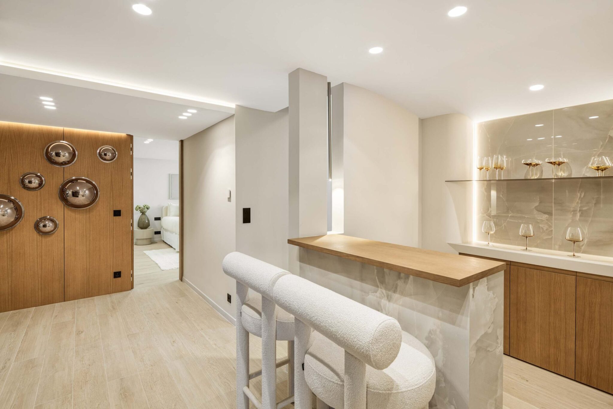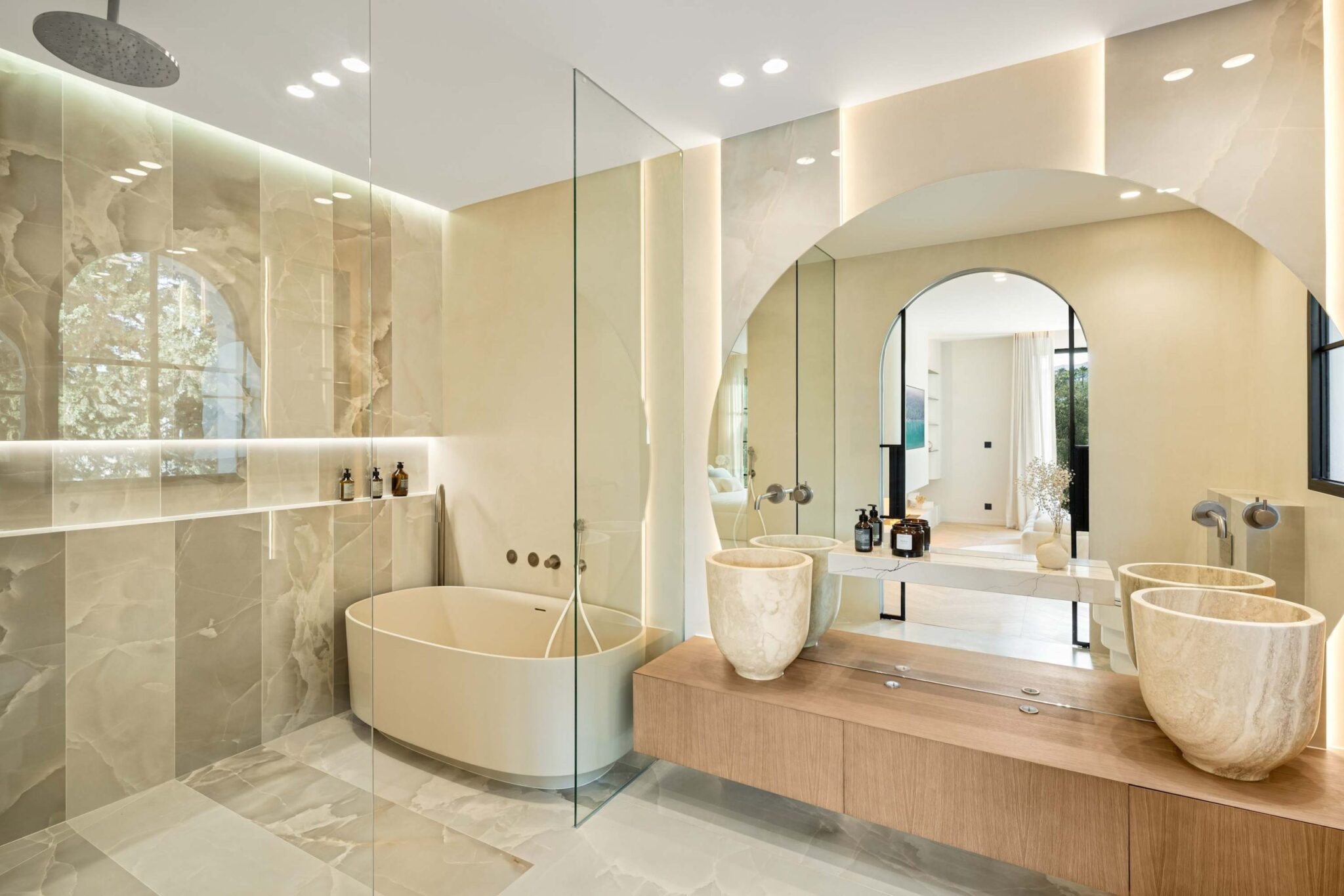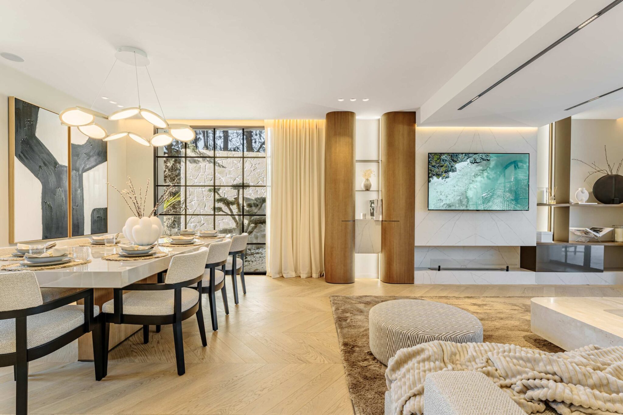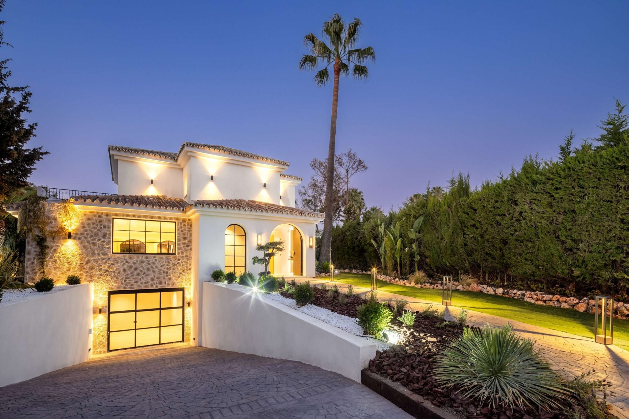 The open-plan living area flows seamlessly into the beautifully landscaped garden, framed by charming arched masonry. A private pool, outdoor dining area, and stylish modern furniture are complemented by intelligent lighting, creating the perfect setting for relaxation or entertaining while enjoying the breathtaking views.
