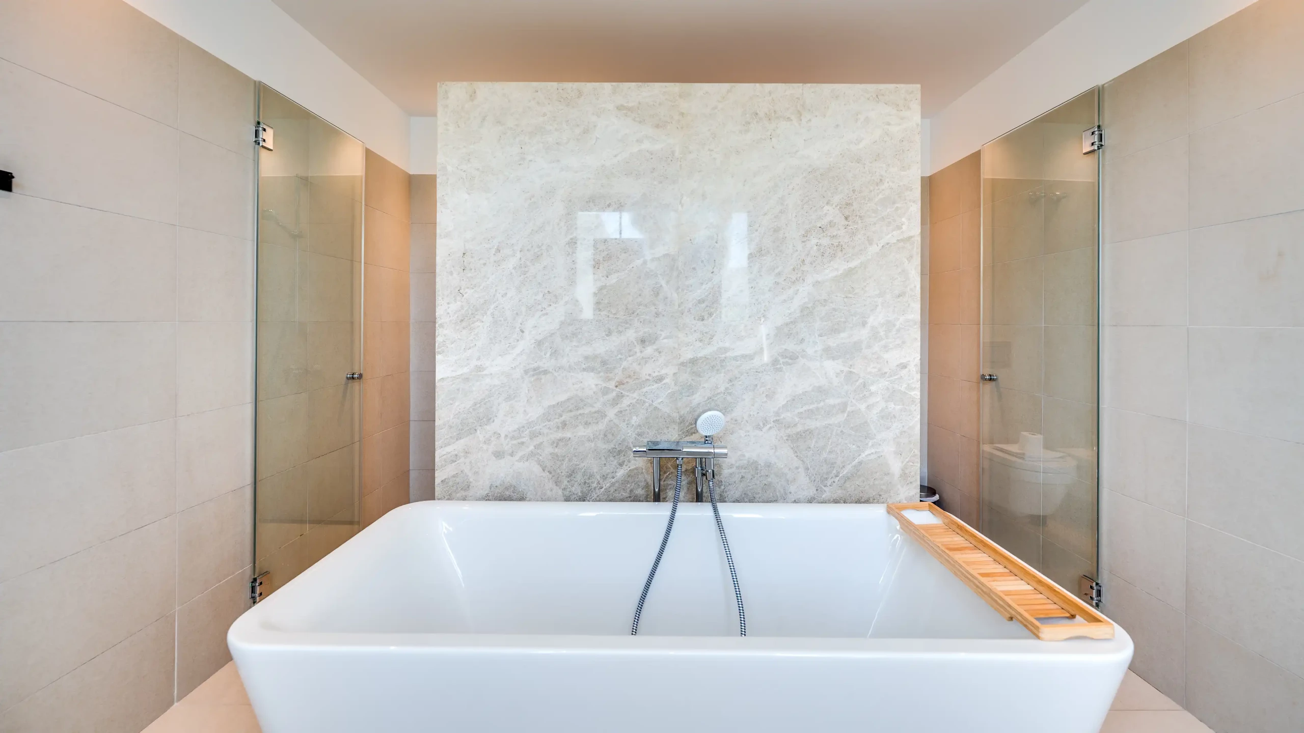 The Villa accommodates up to 10 guests in five elegant bedrooms, each furnished with a plush 180×200 cm king-size bed. Bathrooms are sleek and serene, with one featuring a freestanding soaking tub and rain shower for a spa-like experience.