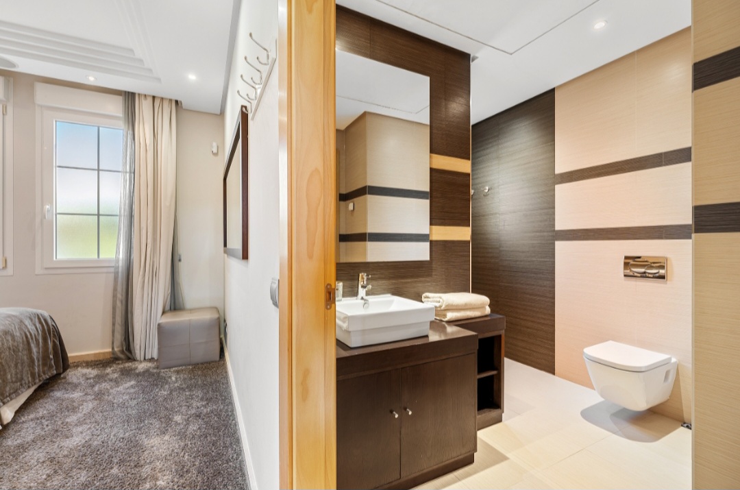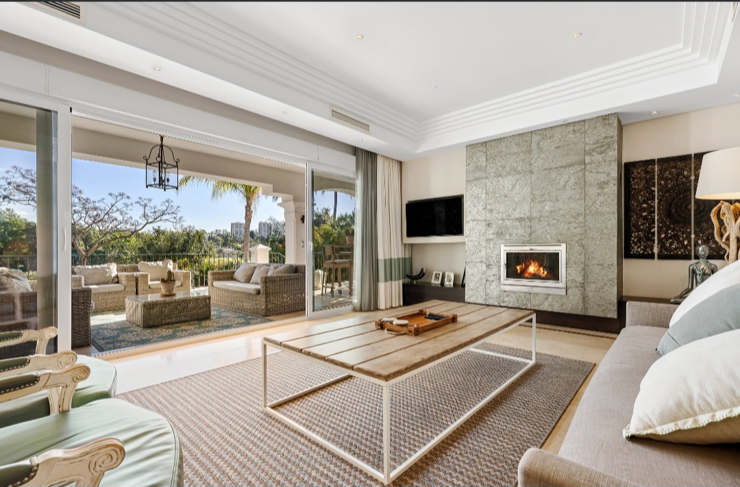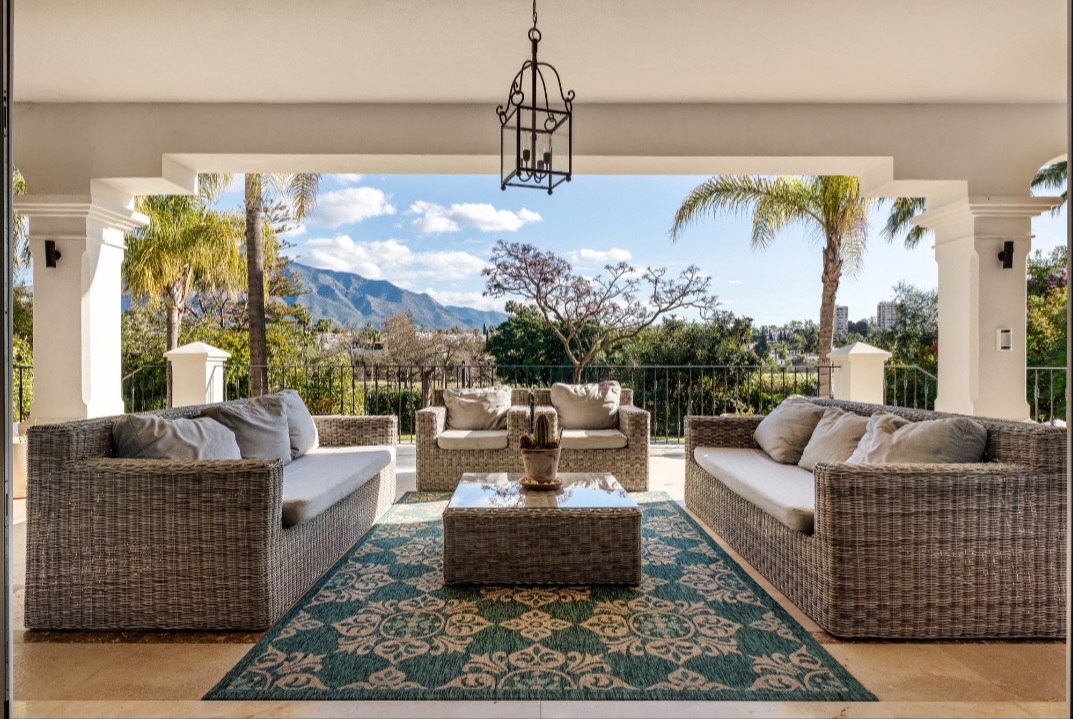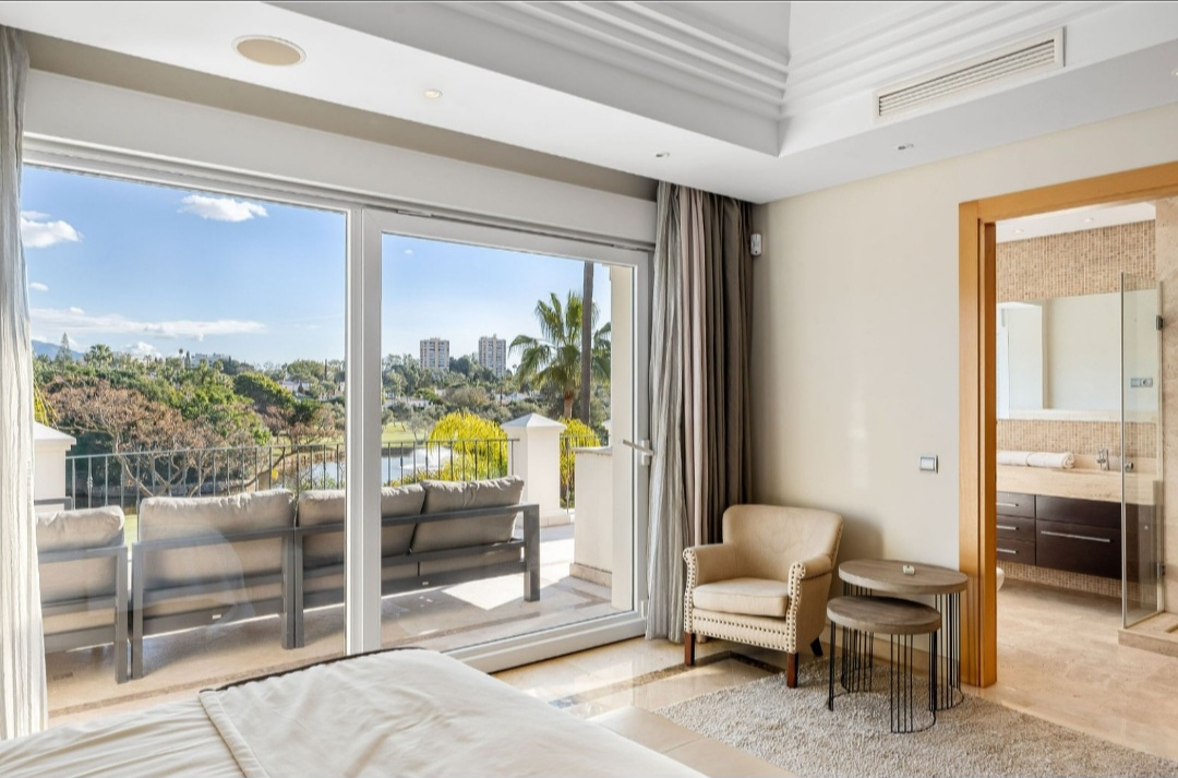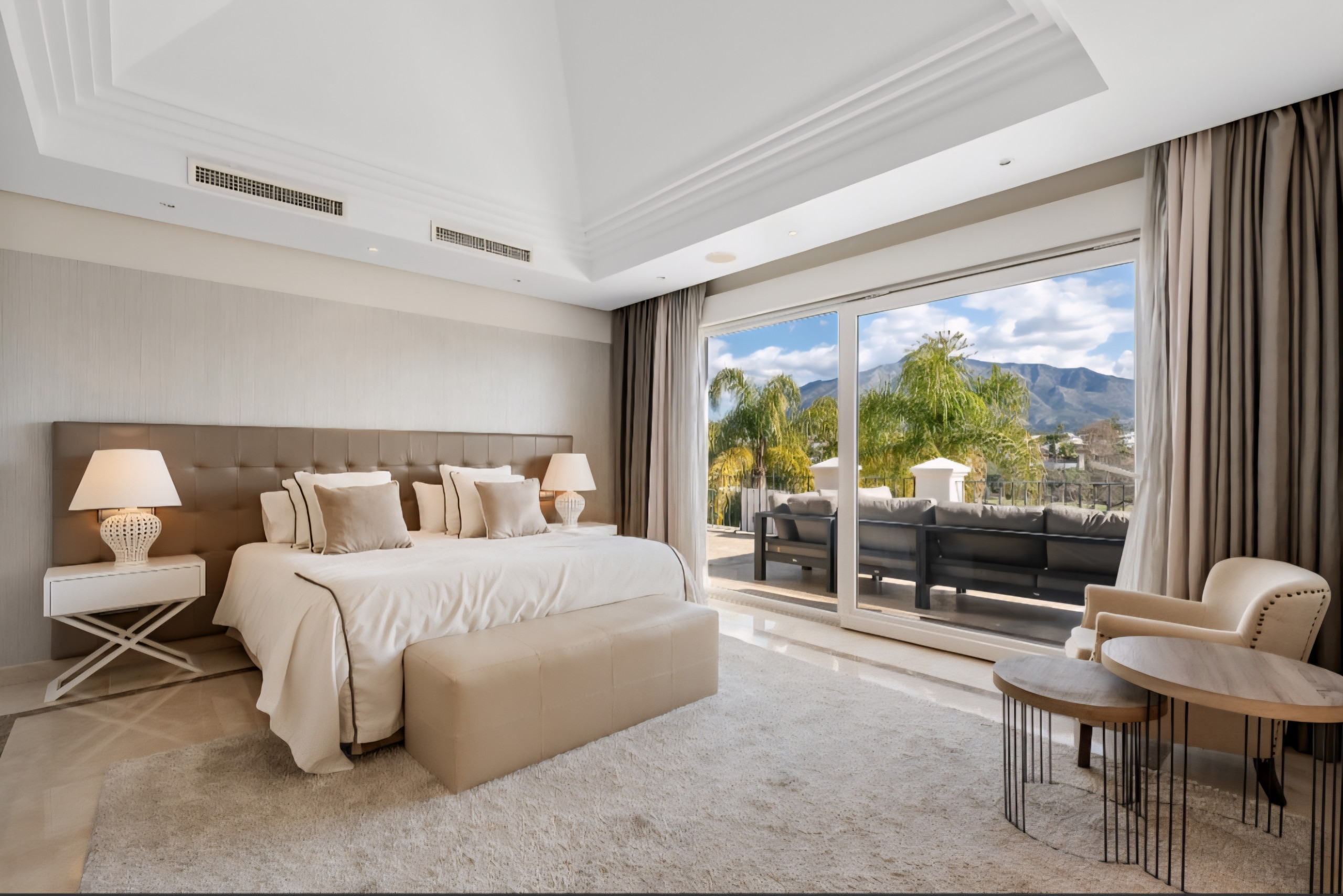 Each of the five spacious bedrooms is en-suite, ensuring privacy and comfort for every guest. The open-plan living area is bright and airy, leading to a sleek, fully equipped kitchen and refined dining space. Floor-to-ceiling windows frame breathtaking views and open out to the villa’s expansive terrace and beautifully landscaped garden. Outdoors, a stunning private pool takes centre stage, surrounded by sun loungers, a stylish fire pit corner, and lush greenery—perfect for soaking up the Marbella sun or enjoying an evening under the stars.