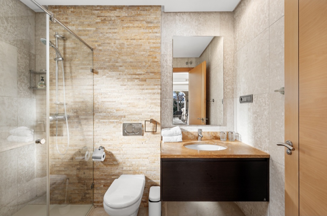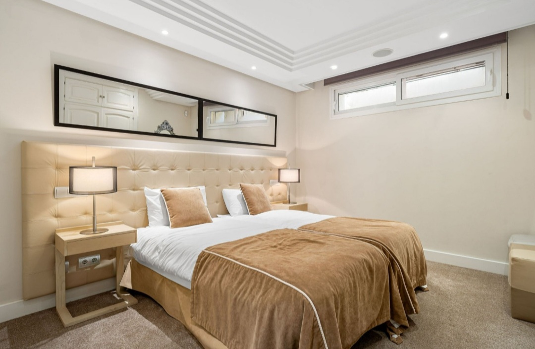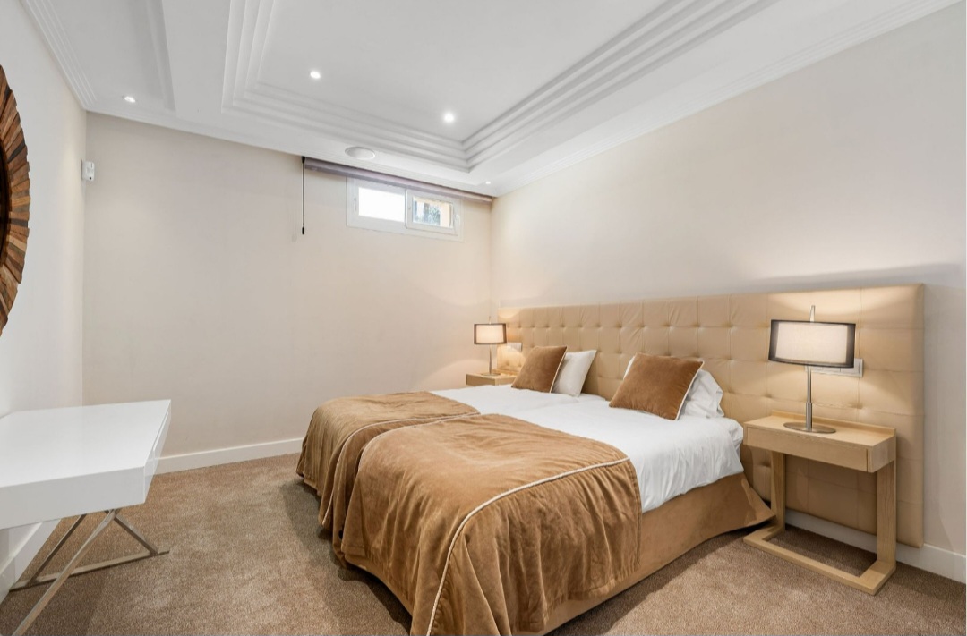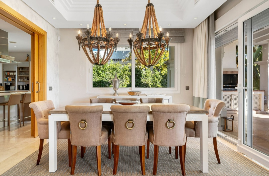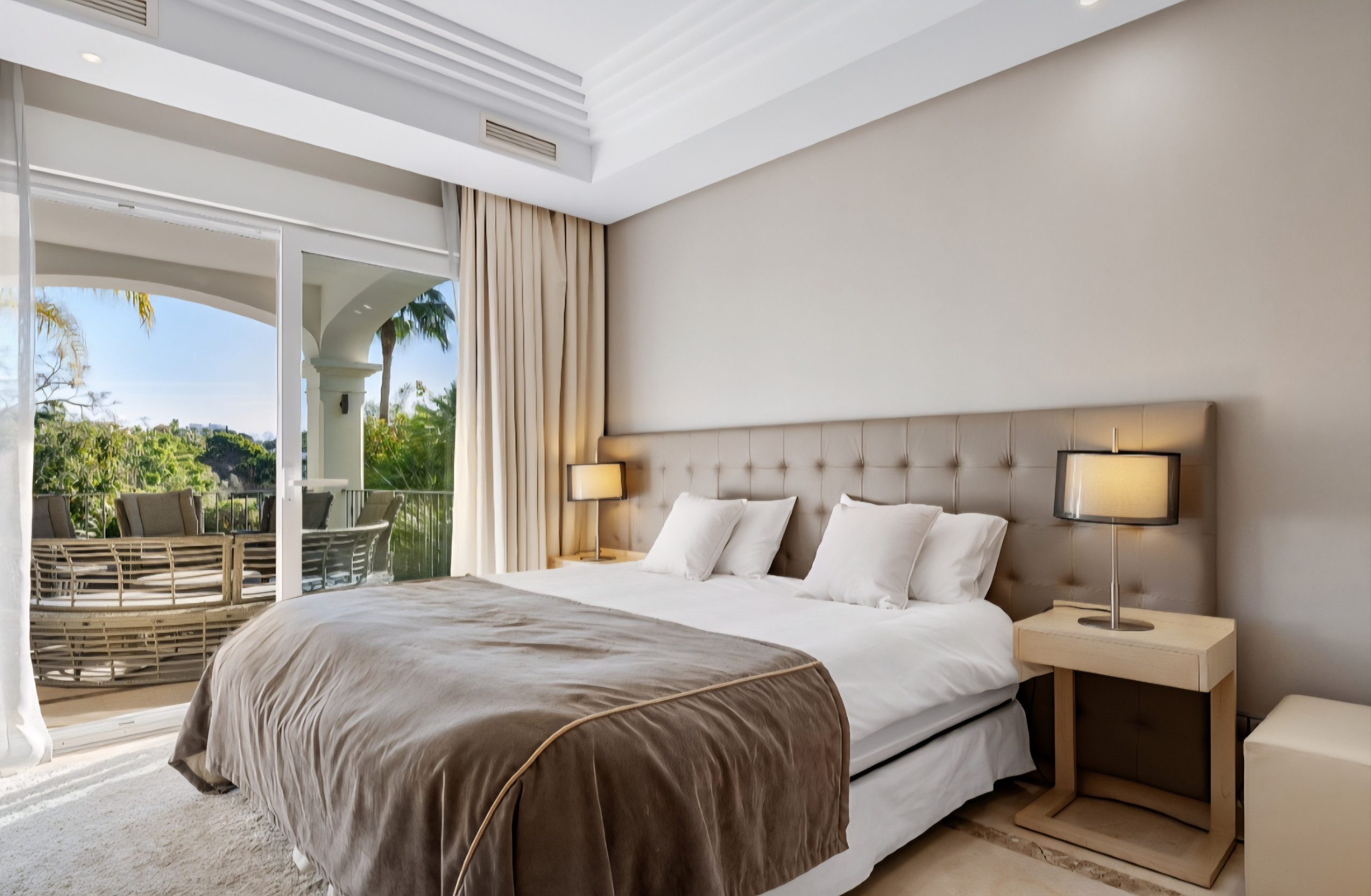 Each of the five spacious bedrooms is en-suite, ensuring privacy and comfort for every guest. The open-plan living area is bright and airy, leading to a sleek, fully equipped kitchen and refined dining space. Floor-to-ceiling windows frame breathtaking views and open out to the villa’s expansive terrace and beautifully landscaped garden. Outdoors, a stunning private pool takes centre stage, surrounded by sun loungers, a stylish fire pit corner, and lush greenery—perfect for soaking up the Marbella sun or enjoying an evening under the stars.