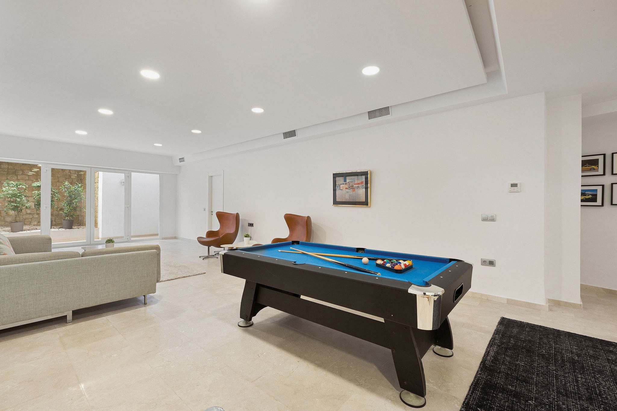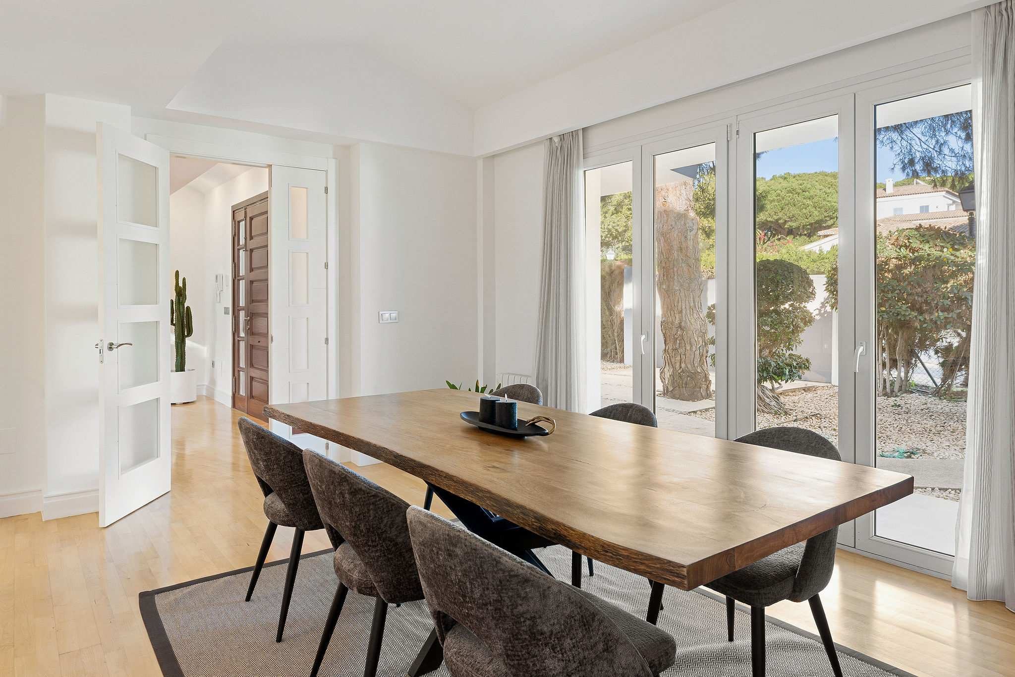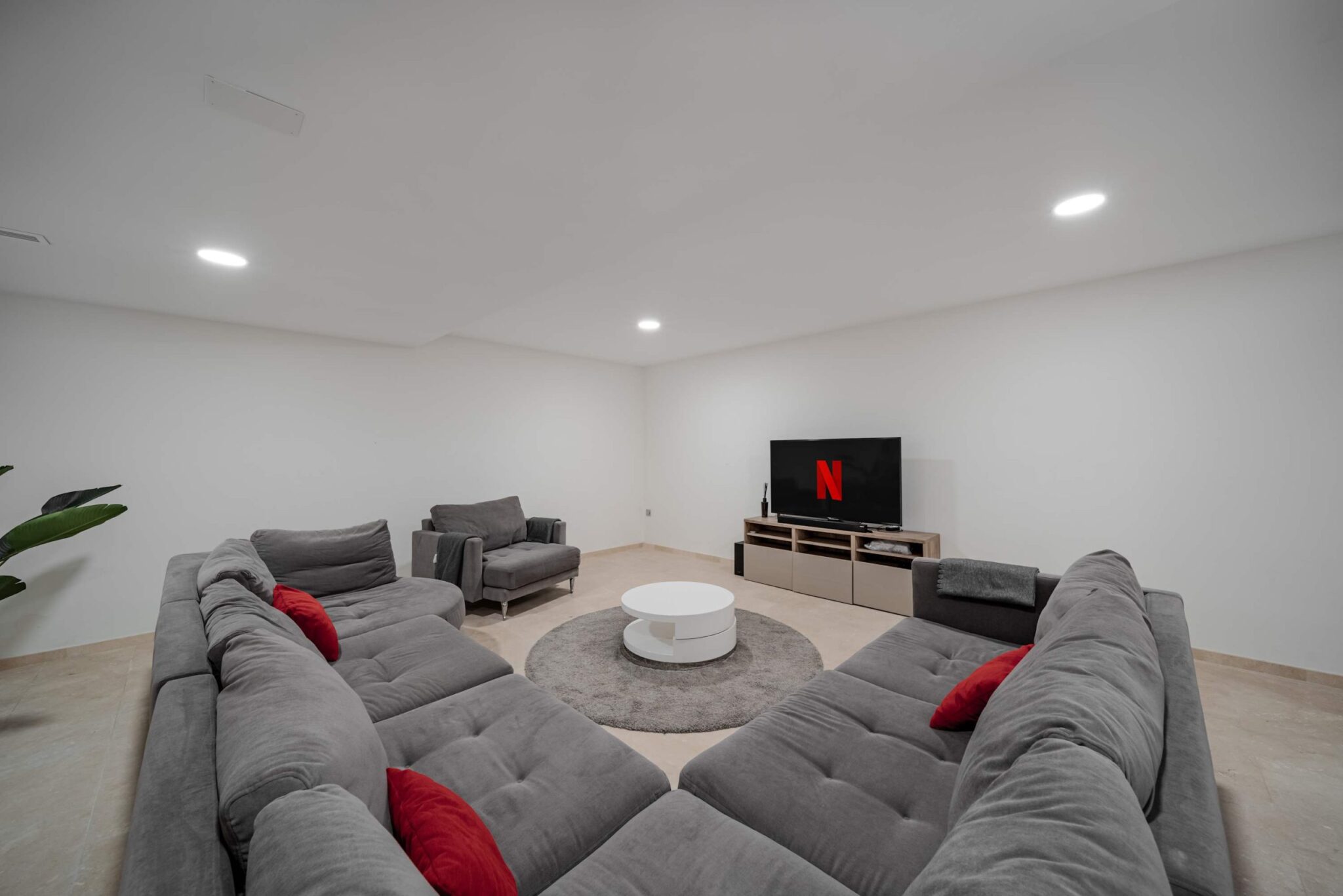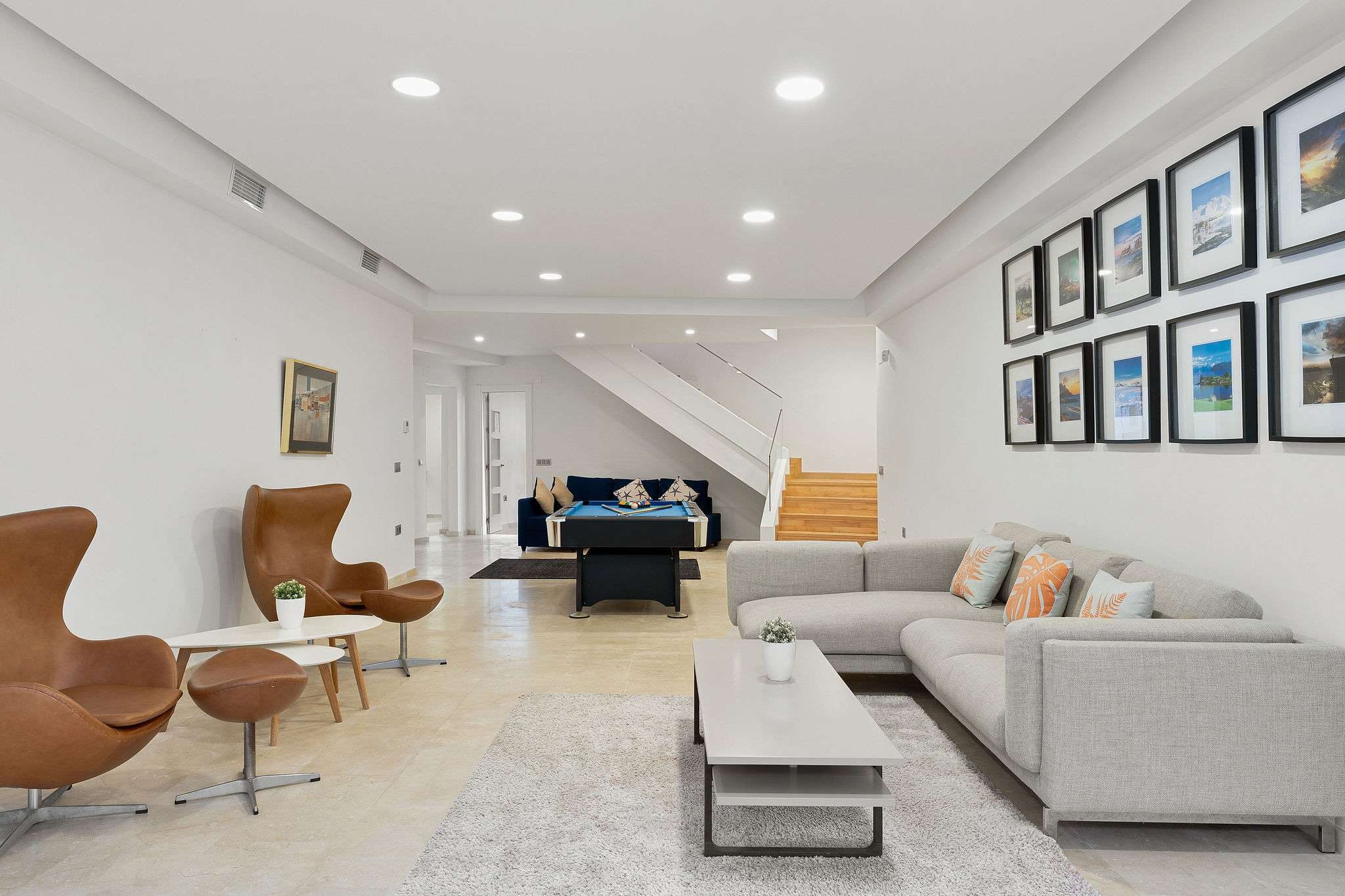 Step into a world of luxury at this exquisite villa, where contemporary Scandinavian design meets Mediterranean elegance. The villa spans three beautifully crafted levels, each offering light filled, open spaces that blend modern comfort with stylish sophistication. Upon entering, you’re greeted by a grand hall leading to a spacious lounge featuring a cozy fireplace and access to a semi covered porch, perfect for relaxing or dining al fresco. The porch opens to a stunning swimming pool and sun deck, ideal for soaking up the sun. The entrance level also boasts a separate dining room adjacent to a sleek Nolte kitchen with a central island, seamlessly connecting to an outdoor dining area complete with a professional gas BBQ. This floor is rounded off with three en-suite bedrooms and two additional bedrooms sharing a stylish bathroom. Venture upstairs to find an open office space that overlooks the living room, leading to the master suite. This serene retreat includes a luxurious bathroom with breathtaking views of the garden and the sea. The lower level is your private oasis, featuring a mini spa with an indoor plunge pool, jacuzzi, sauna, and a fitness room with direct access to the garden. This level also offers a cozy lounge equipped with a pool table, and TV, alongside a double bedroom with access to a charming English patio. There is a dedicated cinema room equipped with a large smart-TV and XBox which can provide hours of entertainment for the entire family. Additionally, this floor houses essential utility spaces like a laundry room and storage areas. Outdoor living is just as impressive, with a large swimming pool, sun deck, and a dining terrace overlooking the serene pool area. The community tennis court is conveniently located just 50 meters from the villa, adding to the plethora of leisure options. The villa’s interior design highlights a harmonious blend of modern aesthetics and Scandinavian influences, with clean lines, vibrant color accents, and luxurious materials throughout, ensuring an unparalleled living experience.