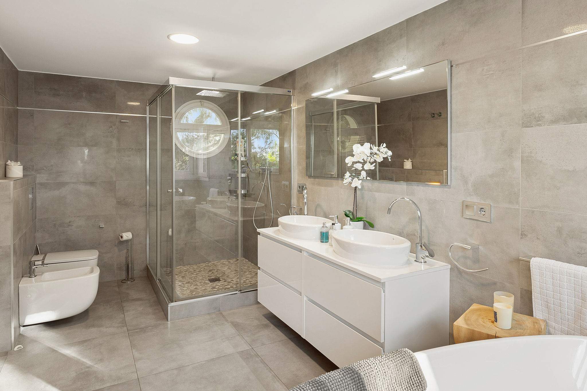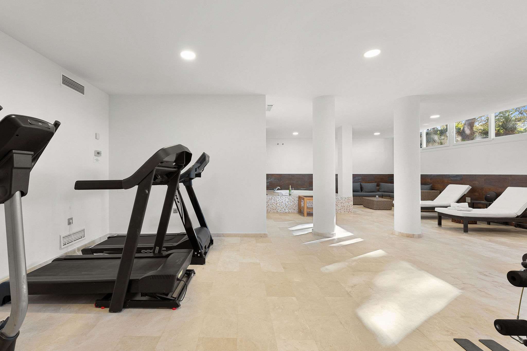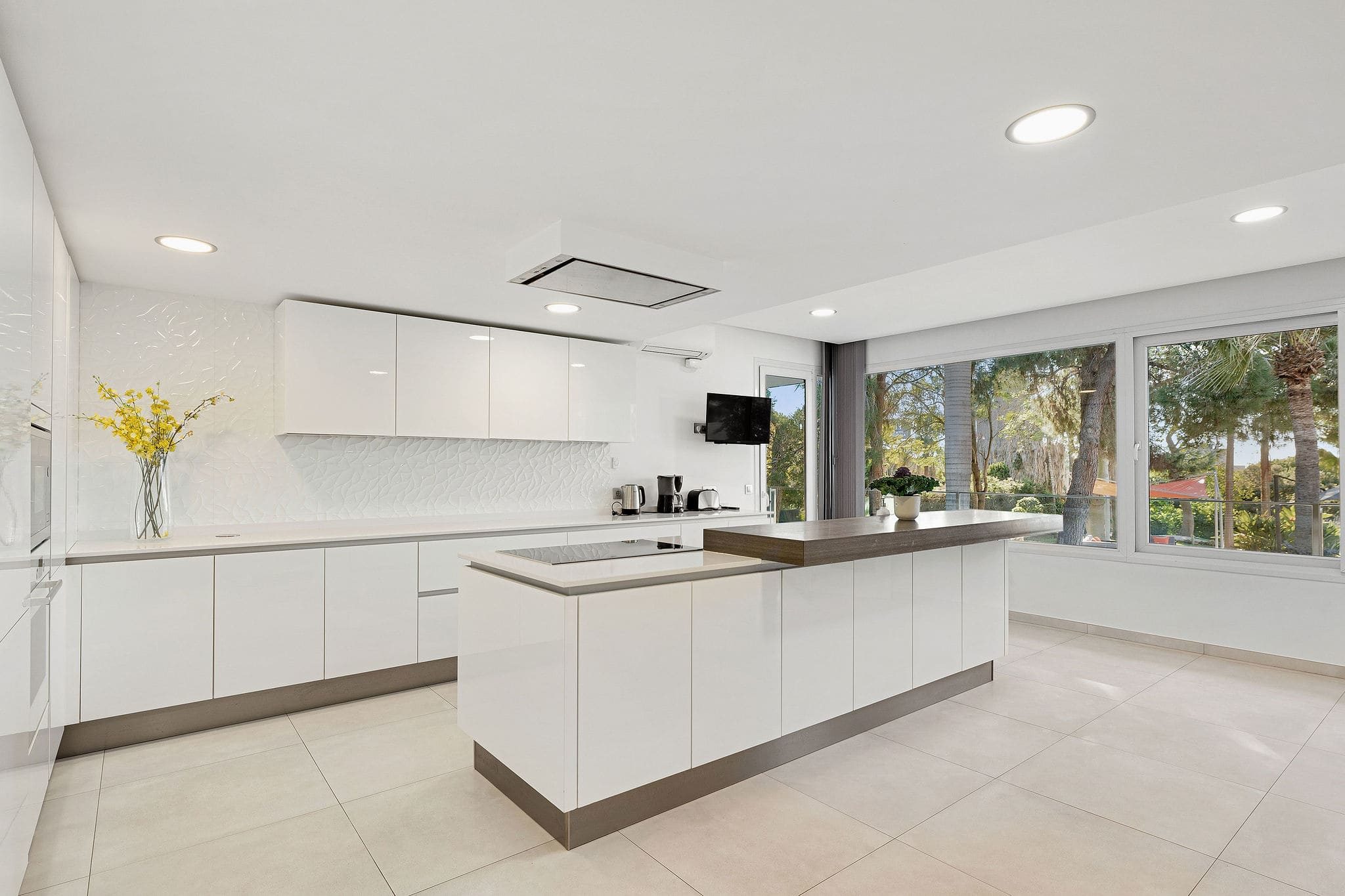 Step into a world of luxury at this exquisite villa, where contemporary Scandinavian design meets Mediterranean elegance. The villa spans three beautifully crafted levels, each offering light filled, open spaces that blend modern comfort with stylish sophistication. Upon entering, you’re greeted by a grand hall leading to a spacious lounge featuring a cozy fireplace and access to a semi covered porch, perfect for relaxing or dining al fresco. The porch opens to a stunning swimming pool and sun deck, ideal for soaking up the sun. The entrance level also boasts a separate dining room adjacent to a sleek Nolte kitchen with a central island, seamlessly connecting to an outdoor dining area complete with a professional gas BBQ. This floor is rounded off with three en-suite bedrooms and two additional bedrooms sharing a stylish bathroom. Venture upstairs to find an open office space that overlooks the living room, leading to the master suite. This serene retreat includes a luxurious bathroom with breathtaking views of the garden and the sea. The lower level is your private oasis, featuring a mini spa with an indoor plunge pool, jacuzzi, sauna, and a fitness room with direct access to the garden. This level also offers a cozy lounge equipped with a pool table, and TV, alongside a double bedroom with access to a charming English patio. There is a dedicated cinema room equipped with a large smart-TV and XBox which can provide hours of entertainment for the entire family. Additionally, this floor houses essential utility spaces like a laundry room and storage areas. Outdoor living is just as impressive, with a large swimming pool, sun deck, and a dining terrace overlooking the serene pool area. The community tennis court is conveniently located just 50 meters from the villa, adding to the plethora of leisure options. The villa’s interior design highlights a harmonious blend of modern aesthetics and Scandinavian influences, with clean lines, vibrant color accents, and luxurious materials throughout, ensuring an unparalleled living experience.