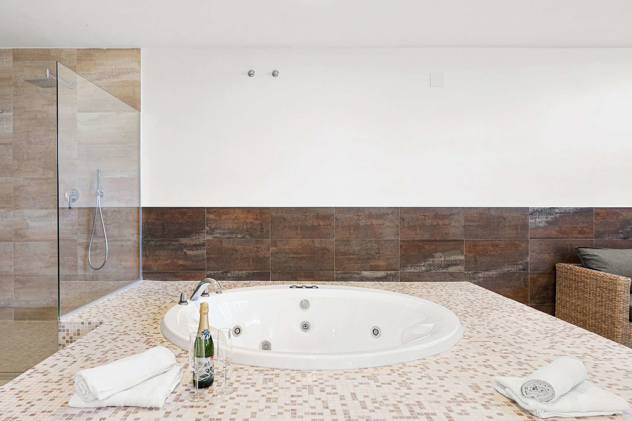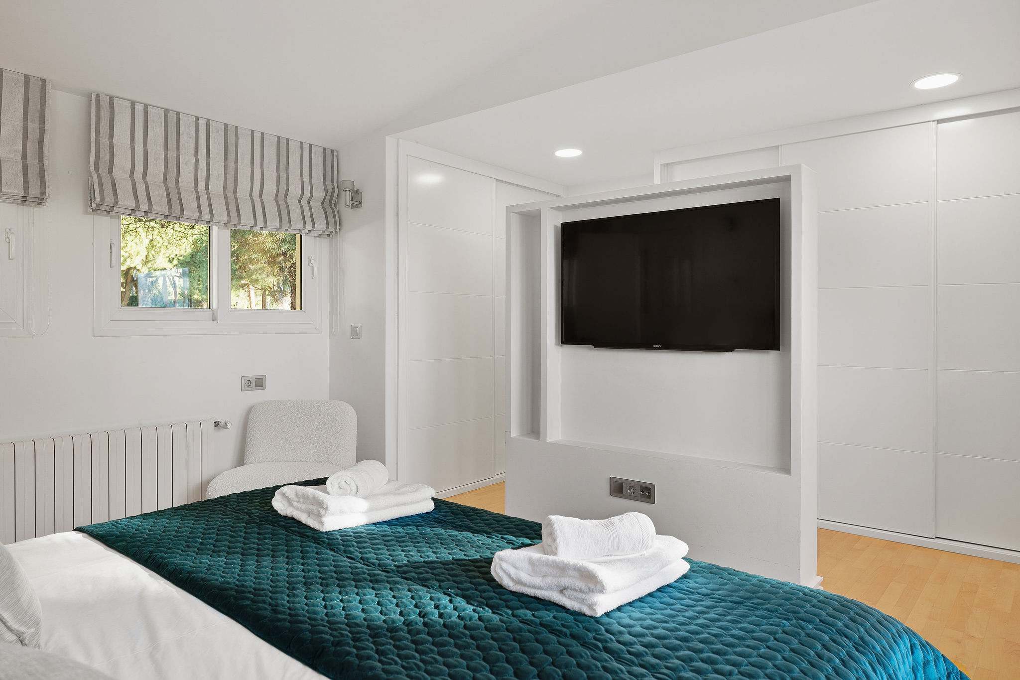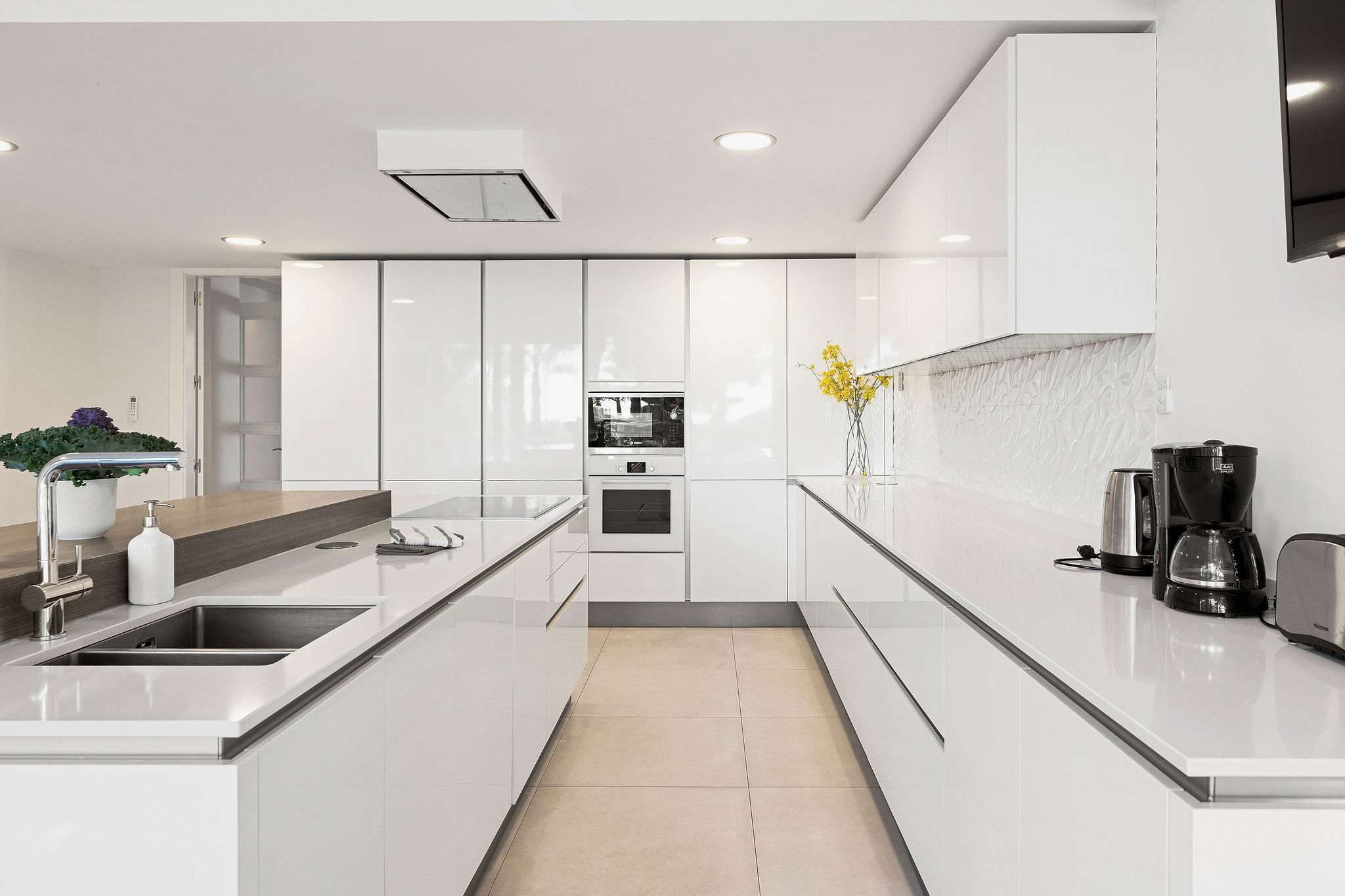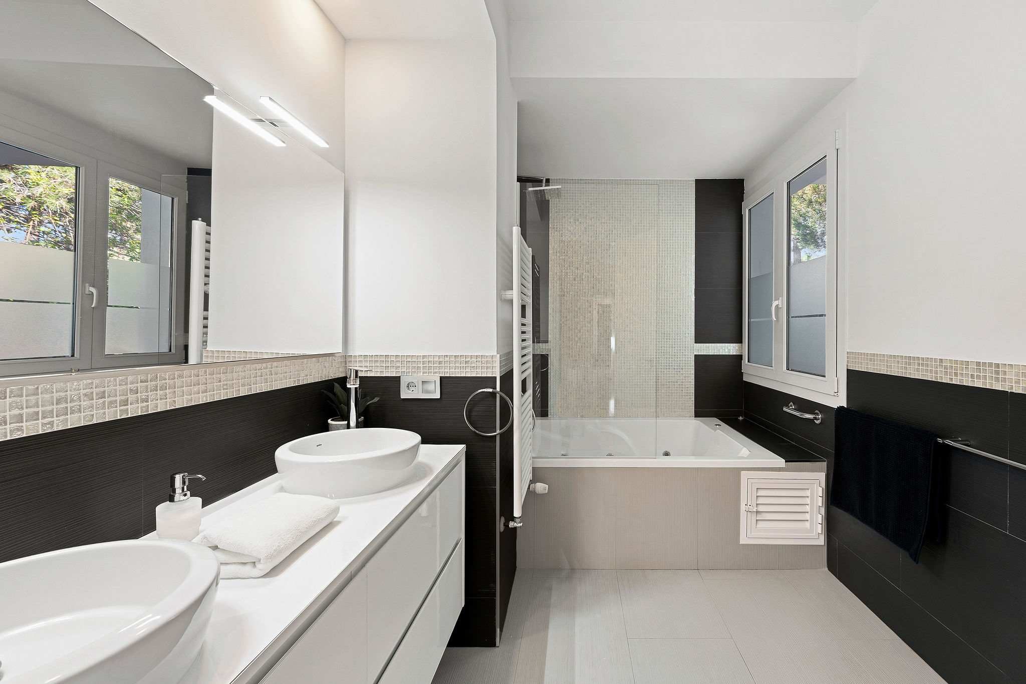 Step into a world of luxury at this exquisite villa, where contemporary Scandinavian design meets Mediterranean elegance. The villa spans three beautifully crafted levels, each offering light filled, open spaces that blend modern comfort with stylish sophistication. Upon entering, you’re greeted by a grand hall leading to a spacious lounge featuring a cozy fireplace and access to a semi covered porch, perfect for relaxing or dining al fresco. The porch opens to a stunning swimming pool and sun deck, ideal for soaking up the sun. The entrance level also boasts a separate dining room adjacent to a sleek Nolte kitchen with a central island, seamlessly connecting to an outdoor dining area complete with a professional gas BBQ. This floor is rounded off with three en-suite bedrooms and two additional bedrooms sharing a stylish bathroom. Venture upstairs to find an open office space that overlooks the living room, leading to the master suite. This serene retreat includes a luxurious bathroom with breathtaking views of the garden and the sea. The lower level is your private oasis, featuring a mini spa with an indoor plunge pool, jacuzzi, sauna, and a fitness room with direct access to the garden. This level also offers a cozy lounge equipped with a pool table, and TV, alongside a double bedroom with access to a charming English patio. There is a dedicated cinema room equipped with a large smart-TV and XBox which can provide hours of entertainment for the entire family. Additionally, this floor houses essential utility spaces like a laundry room and storage areas. Outdoor living is just as impressive, with a large swimming pool, sun deck, and a dining terrace overlooking the serene pool area. The community tennis court is conveniently located just 50 meters from the villa, adding to the plethora of leisure options. The villa’s interior design highlights a harmonious blend of modern aesthetics and Scandinavian influences, with clean lines, vibrant color accents, and luxurious materials throughout, ensuring an unparalleled living experience.