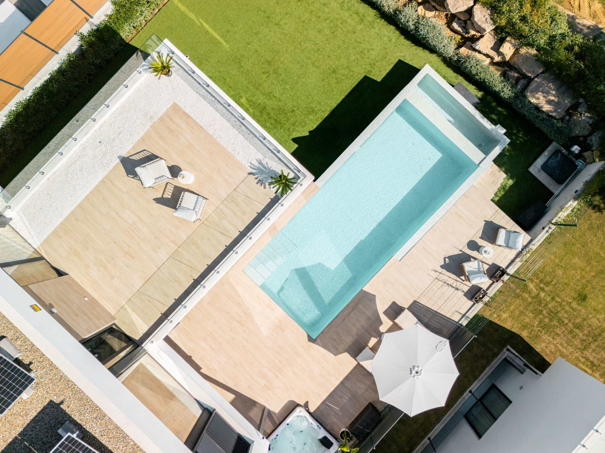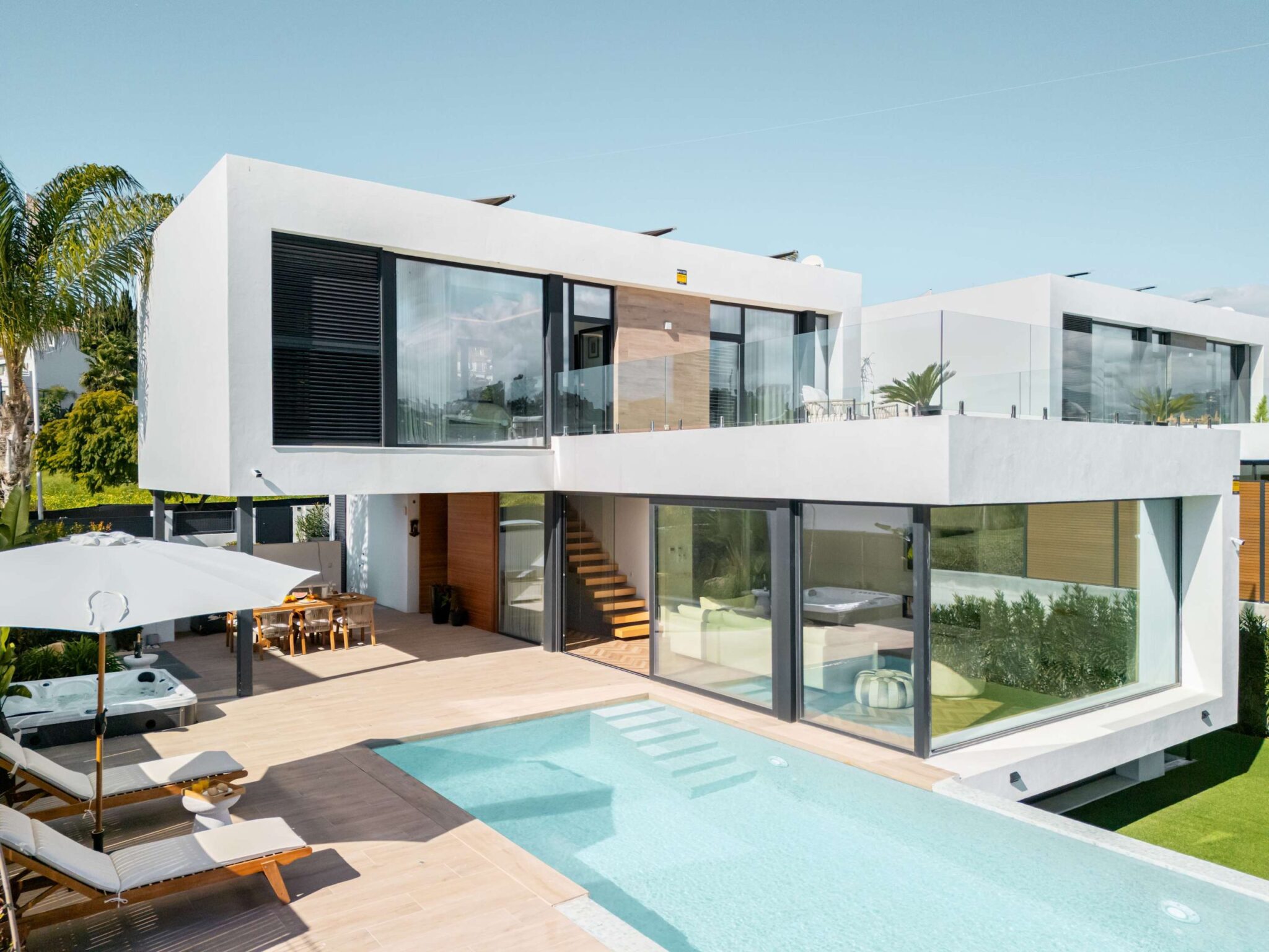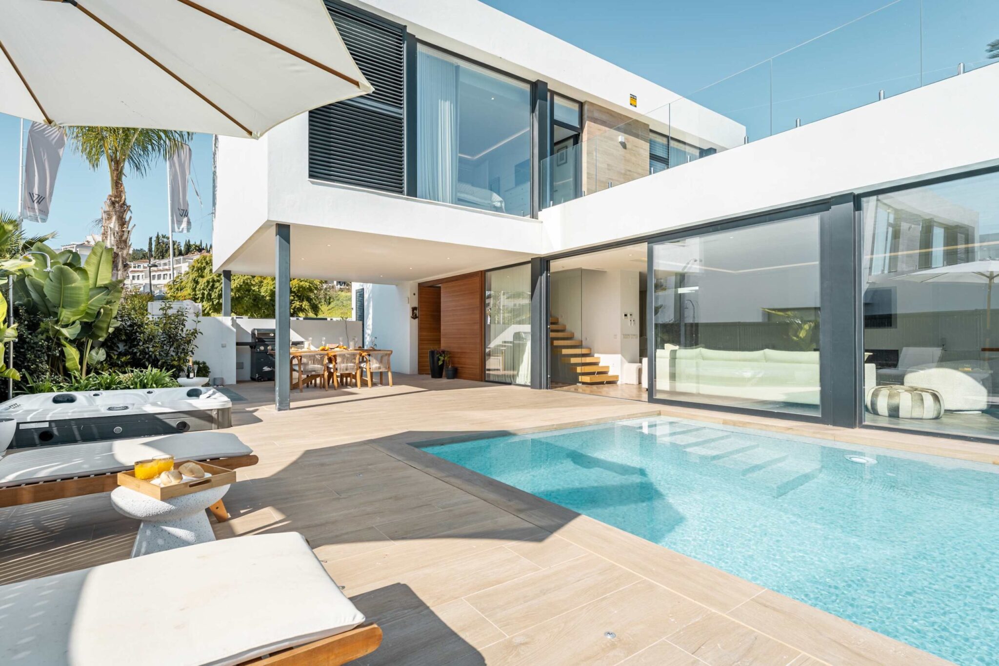 Experience modern comfort and style at Villa Paradise beautiful retreat for up to 8 guests. With 4 spacious bedrooms and 4 bathrooms, this villa is perfect for families and friends looking to relax in a peaceful setting. Designed with high quality materials, the villa features a bright, open plan layout that fills the space with natural light. The impressive entrance hall leads to a spacious living area with stunning views through floor to ceiling windows. The fully equipped kitchen, complete with a central island and breakfast area, is ideal for gathering, while the outdoor barbecue and dining space make al fresco meals a delight. Step outside to a beautiful private garden, where a sparkling pool, sunbeds, and lounge areas invite you to unwind. Enjoy the jacuzzi or simply take in the peaceful surroundings, this villa is designed for relaxation. Whether you’re looking for a quiet retreat or a stylish getaway, Villa Francesca offers a luxurious escape, close to everything you need.