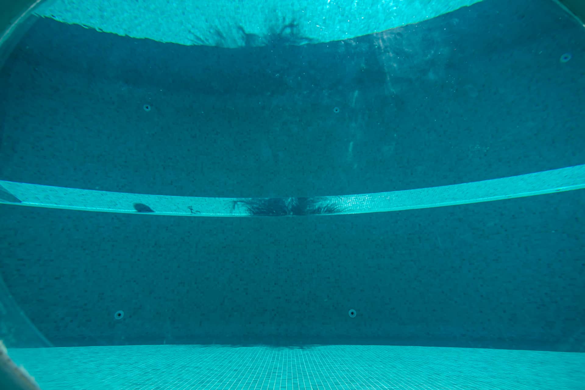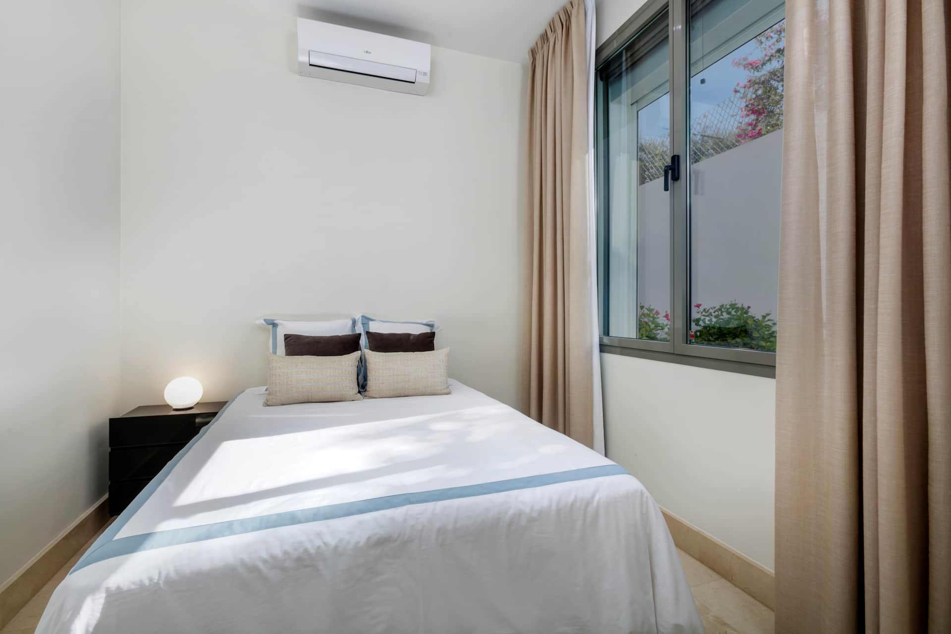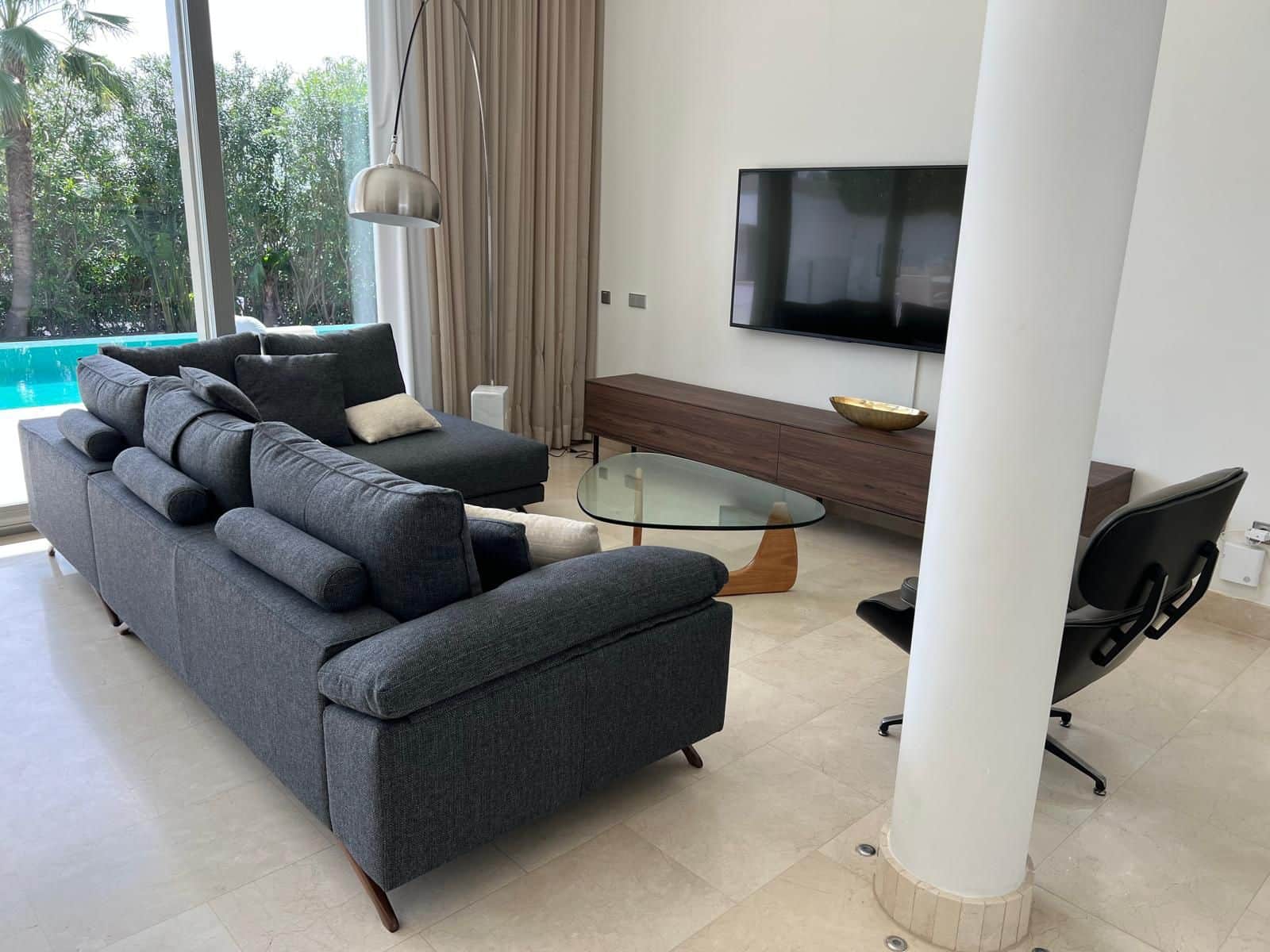Through the front door guests find themselves with the open plan kitchen to the left, staircase downstairs and living room in front. The master bedroom and first and second guest bedroom are located on this level on opposite ends of the villa, with 2 additional bedrooms located downstairs. The kitchen is fully equipped with all the appliances and utensils guests could need if deciding to cook and entertain from their home away from home. It seamlessly integrates with the dining area and living room, which is a comfortable L-Shaped sofa facing a large smart TV. Enormous sliding windows provide access to the outside areas and bathe the living area in natural light.