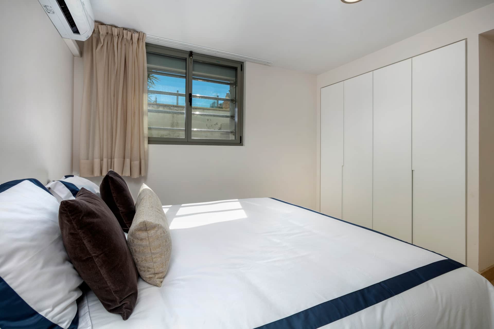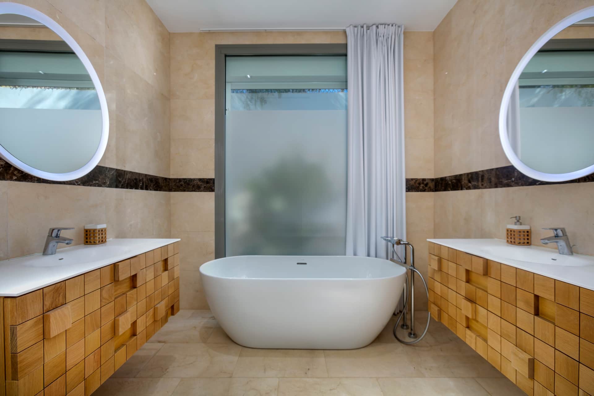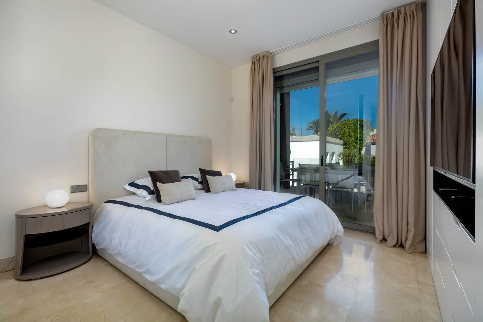 The master bedroom offers a queen size bed, smart TV, plenty of wardrobe space, direct access onto the terrace, and a large ensuite bathroom with 2 washbasins, bathtub and separate shower. The first guest bedroom has a large double bed, access onto the terrace, and ensuite bathroom with walk-in shower. The second guest bedroom also has a double bed, with access to the guest bathroom with walk-in shower. Downstairs, guests will find a spacious basement, which offers 2 additional bedrooms both fitted with large double beds. They share access to a bathroom with shower.