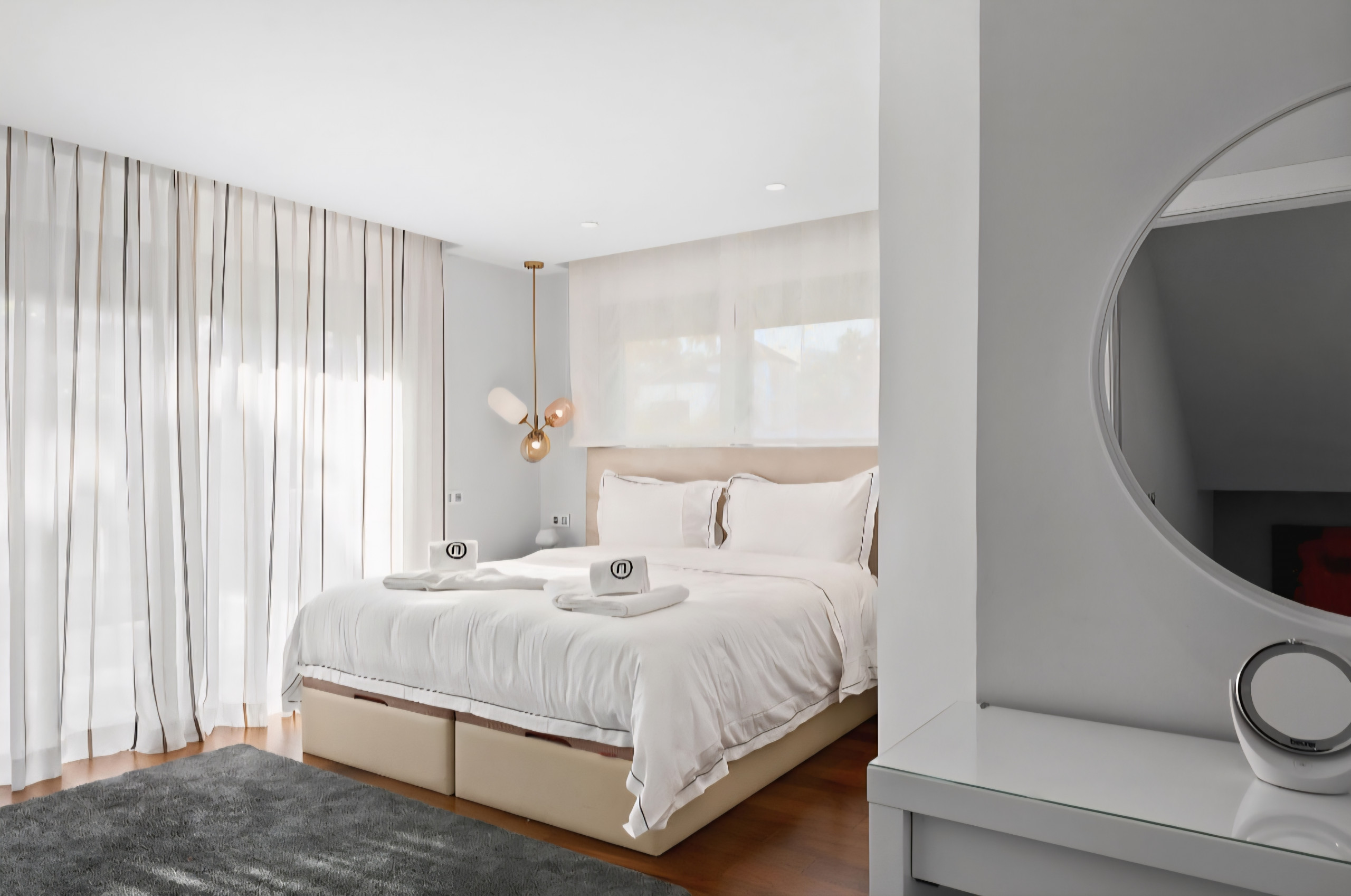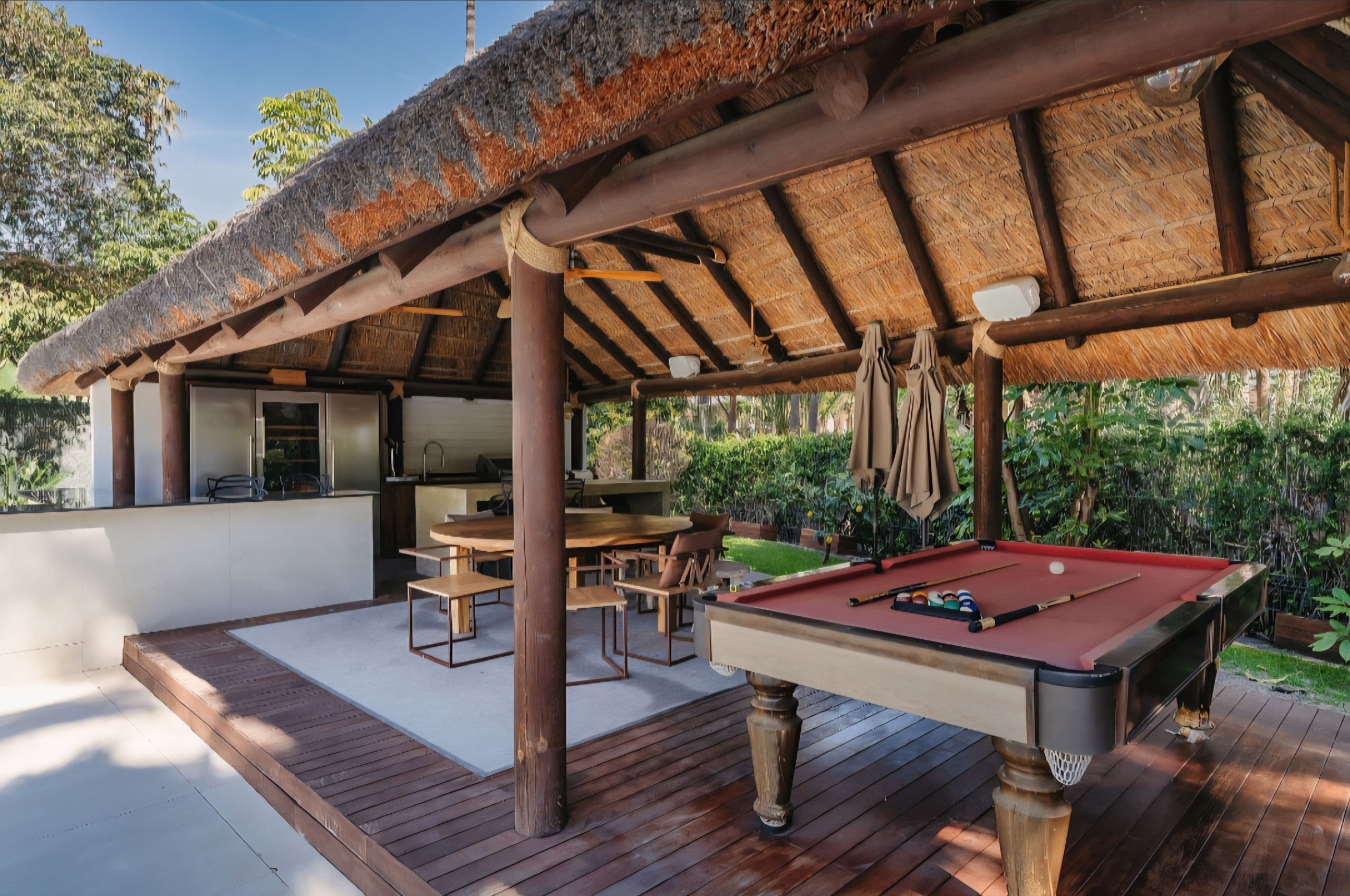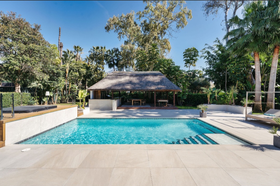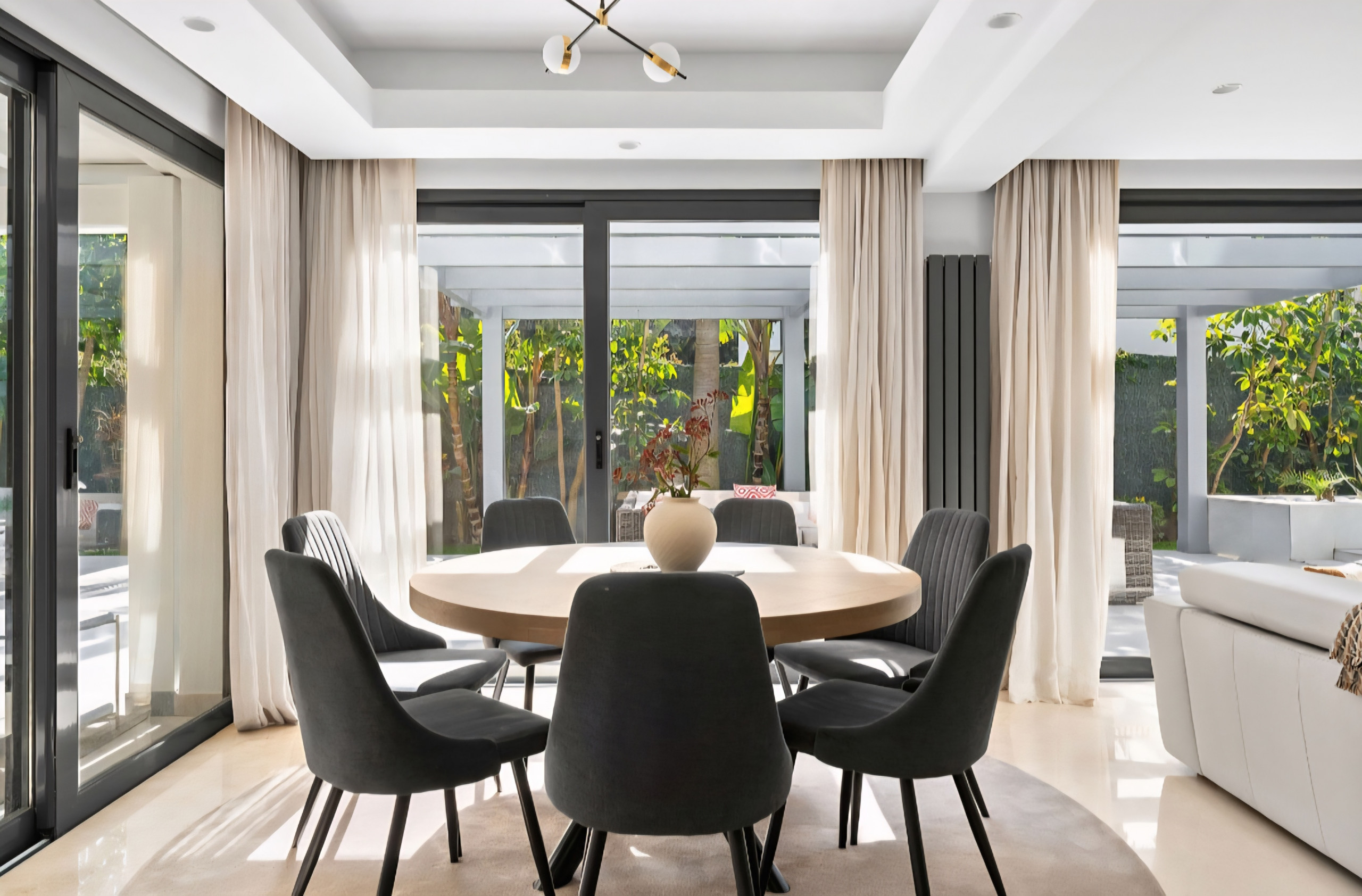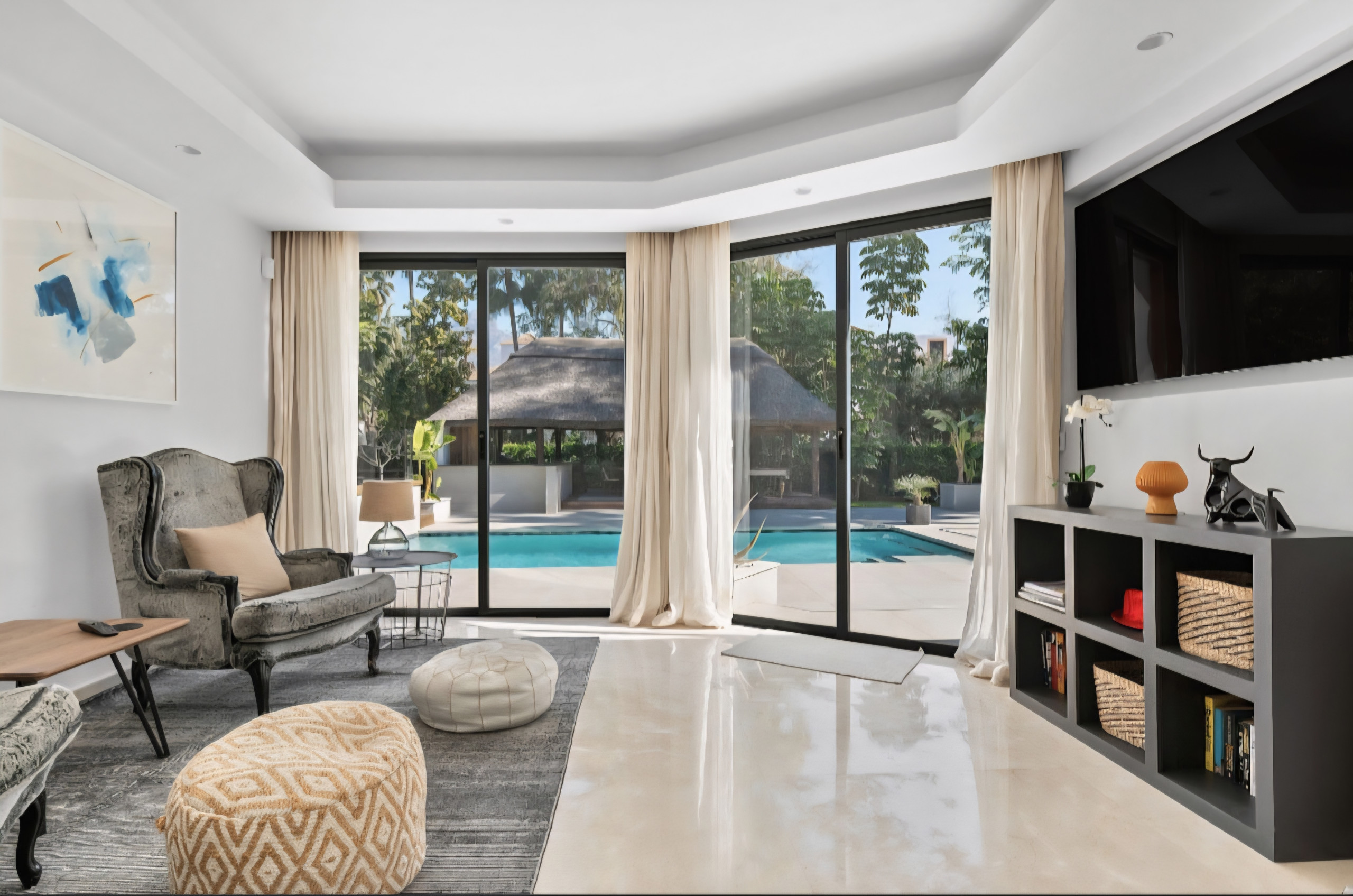 Outdoor living is equally spectacular: a long dining table for 14 guests, a sparkling swimming pool, a shaded gazebo for relaxing, and a comfortable lounge area for lazy, sun-soaked days. Every corner of Villa Las Brisas has been designed to combine style, comfort, and the ultimate Mediterranean lifestyle.