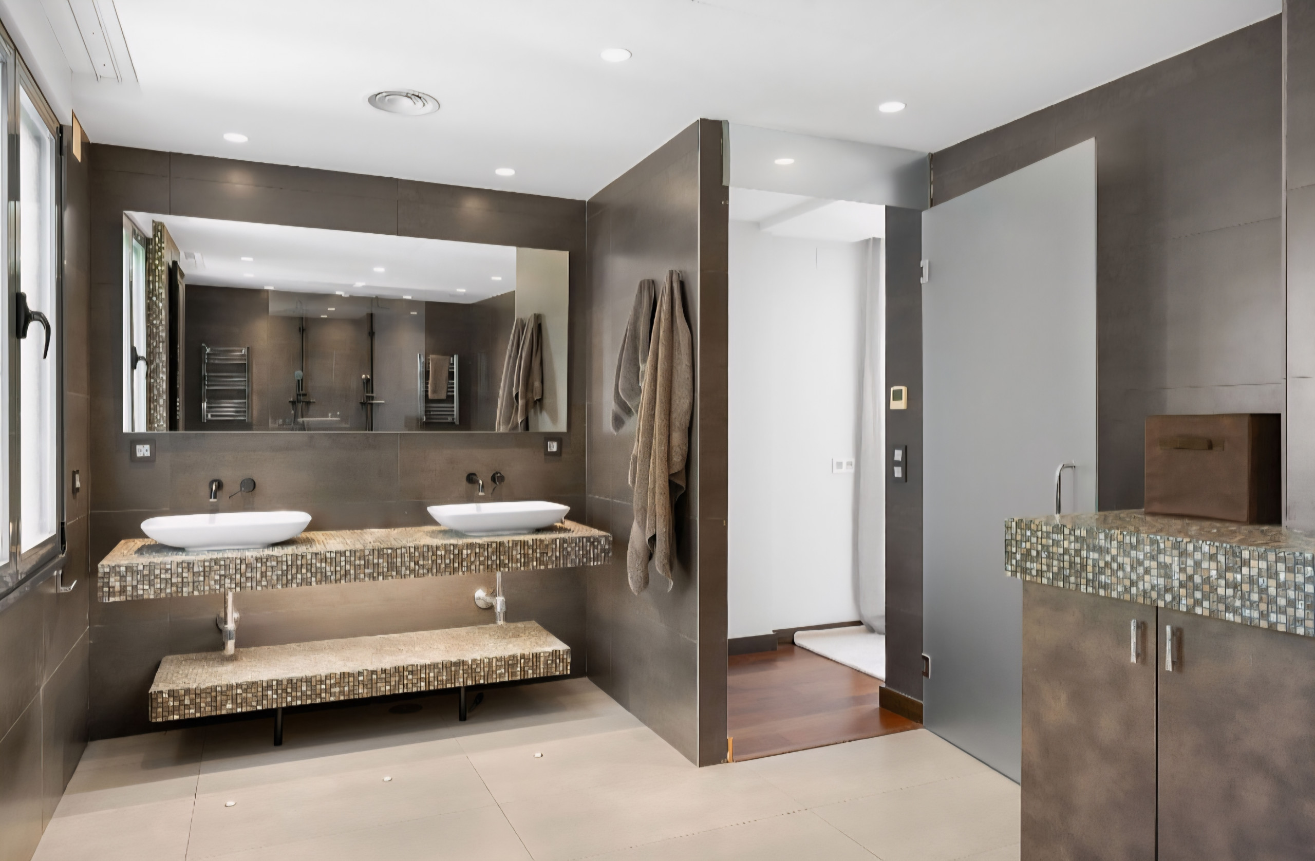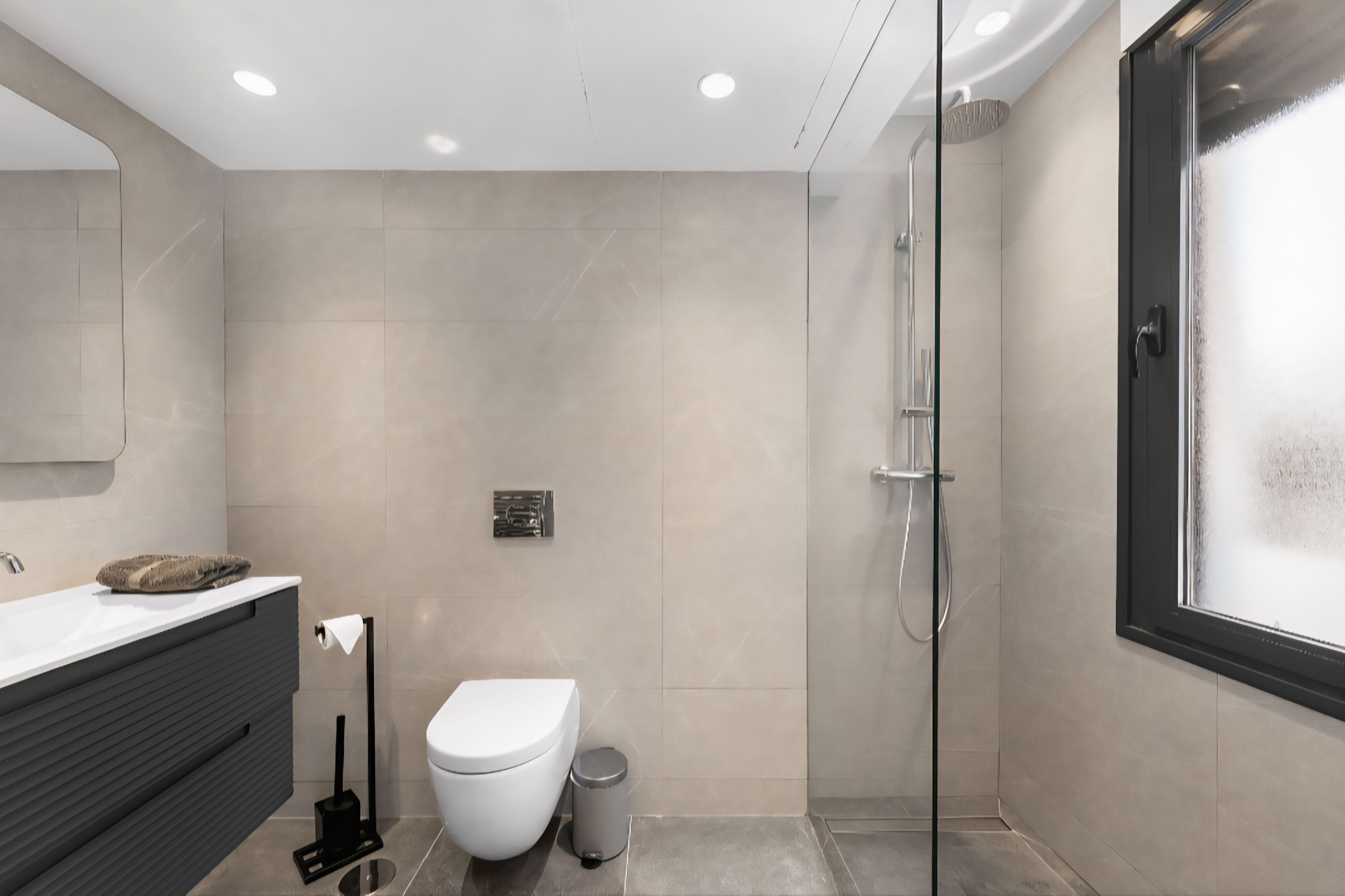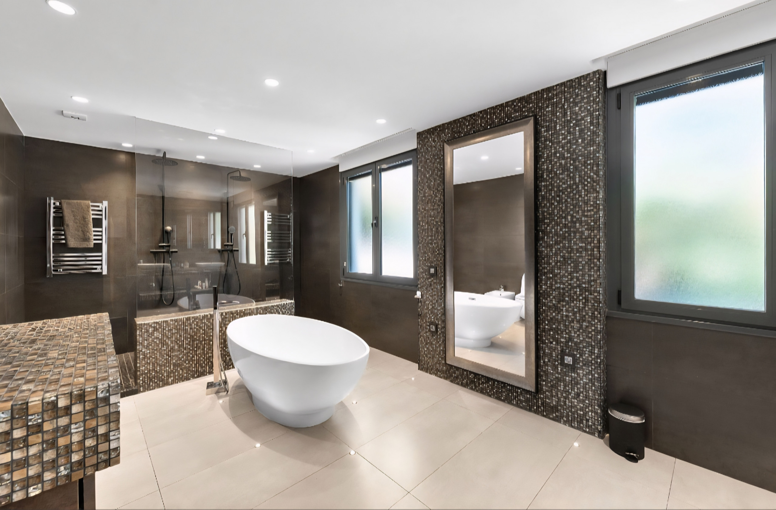 Upstairs, the master and additional bedrooms offer luxurious private bathrooms and access to a generous terrace, perfect for soaking up the sun. The ensuite master bedroom boasts stunning views of the surrounding trees, a large terrace, a spacious walk-in wardrobe, and a luxurious bathroom complete with both a shower and a bathtub.