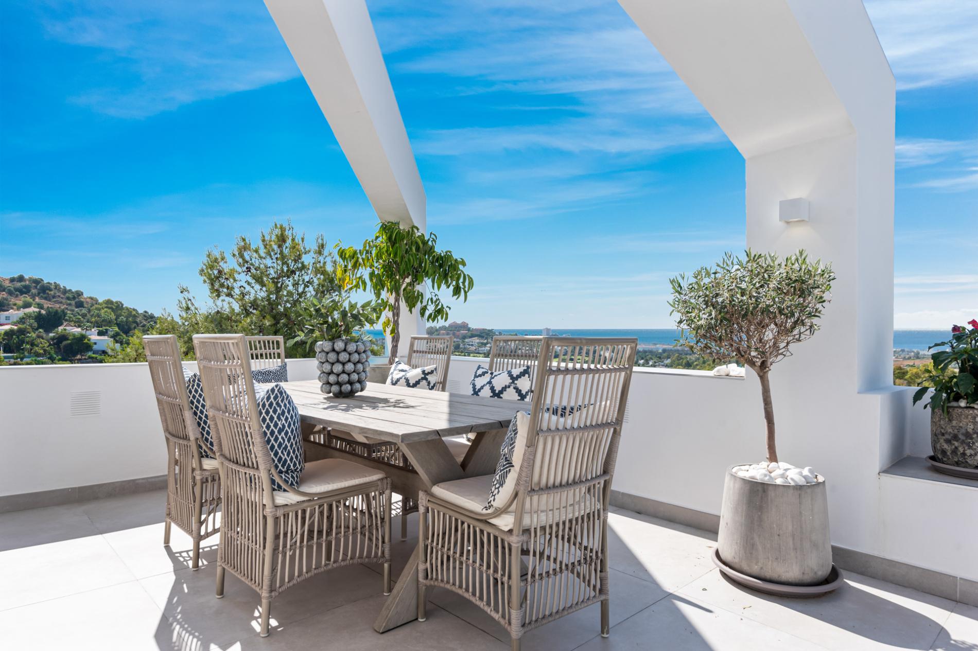 Casa Los Olmos is a stunning, newly renovated 3-bedroom penthouse in La Quinta with incredible views of La Concha and the Mediterranean Sea with the coast of Africa in the backdrop.