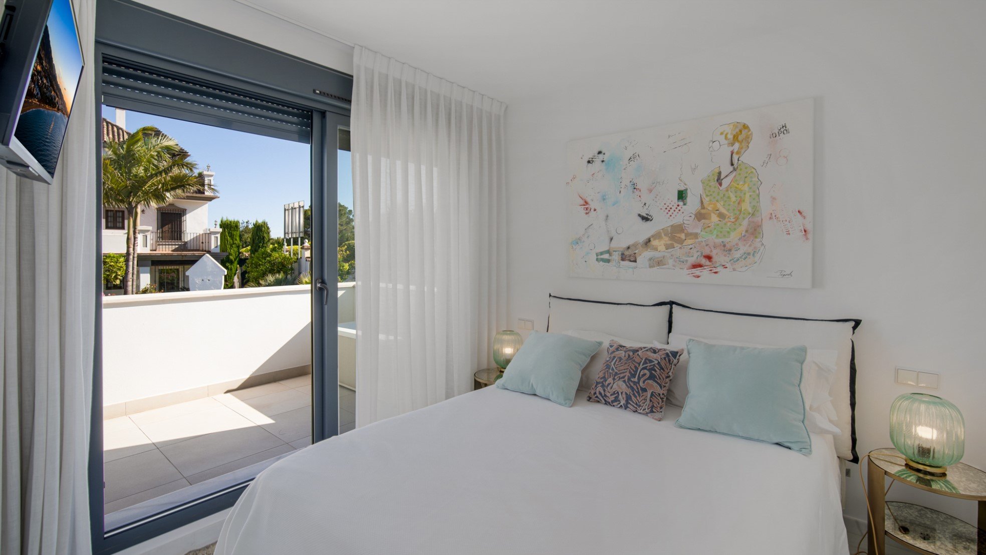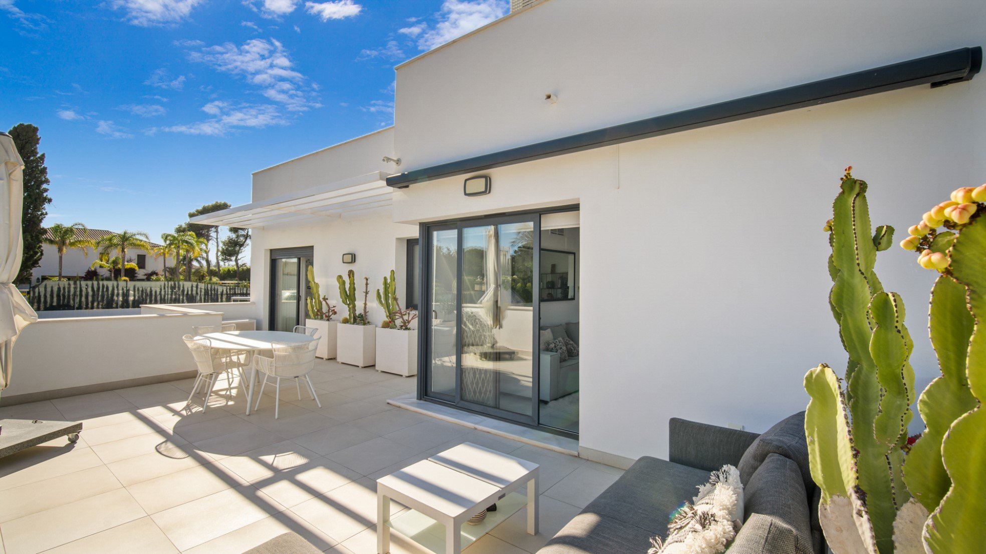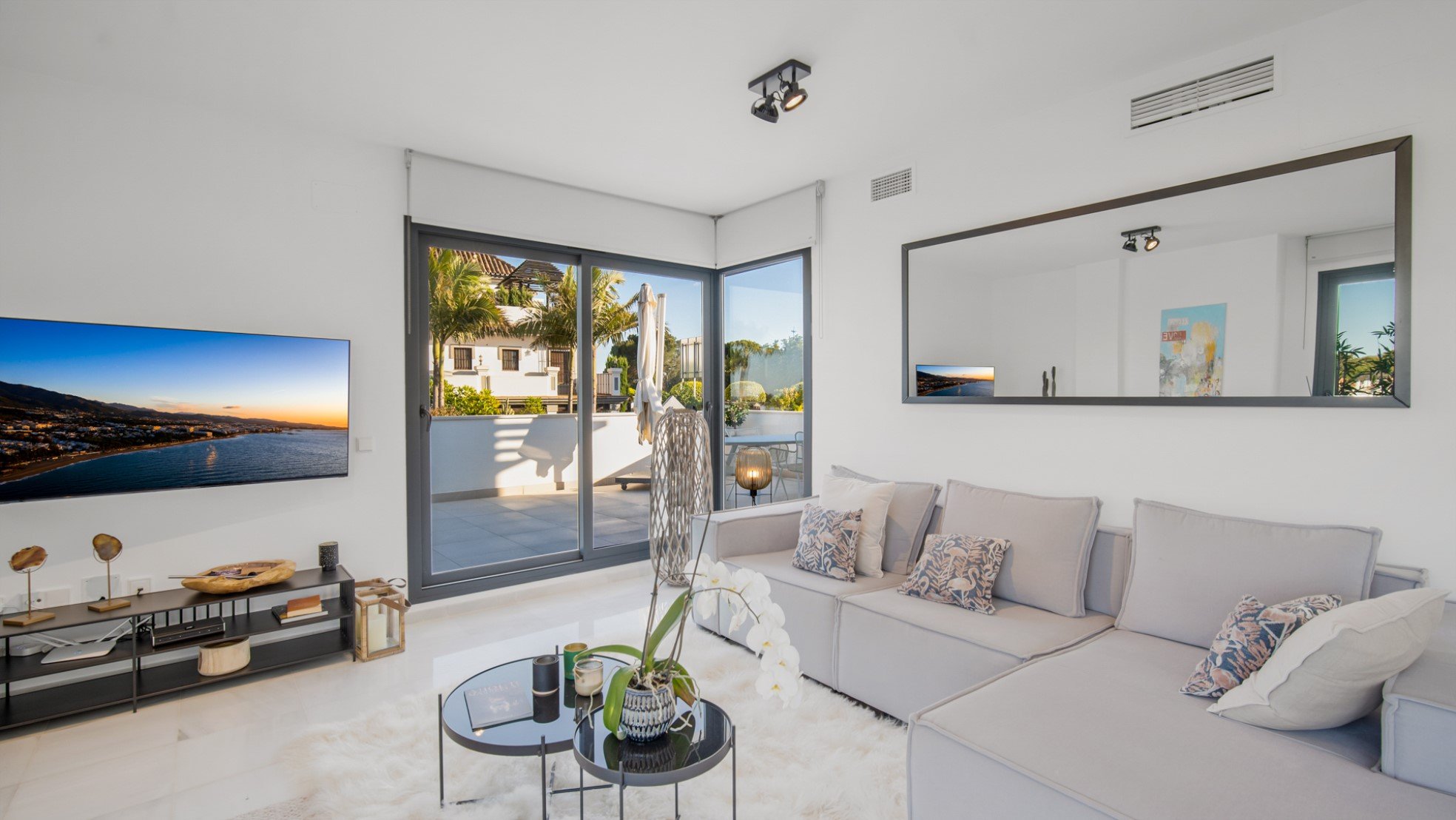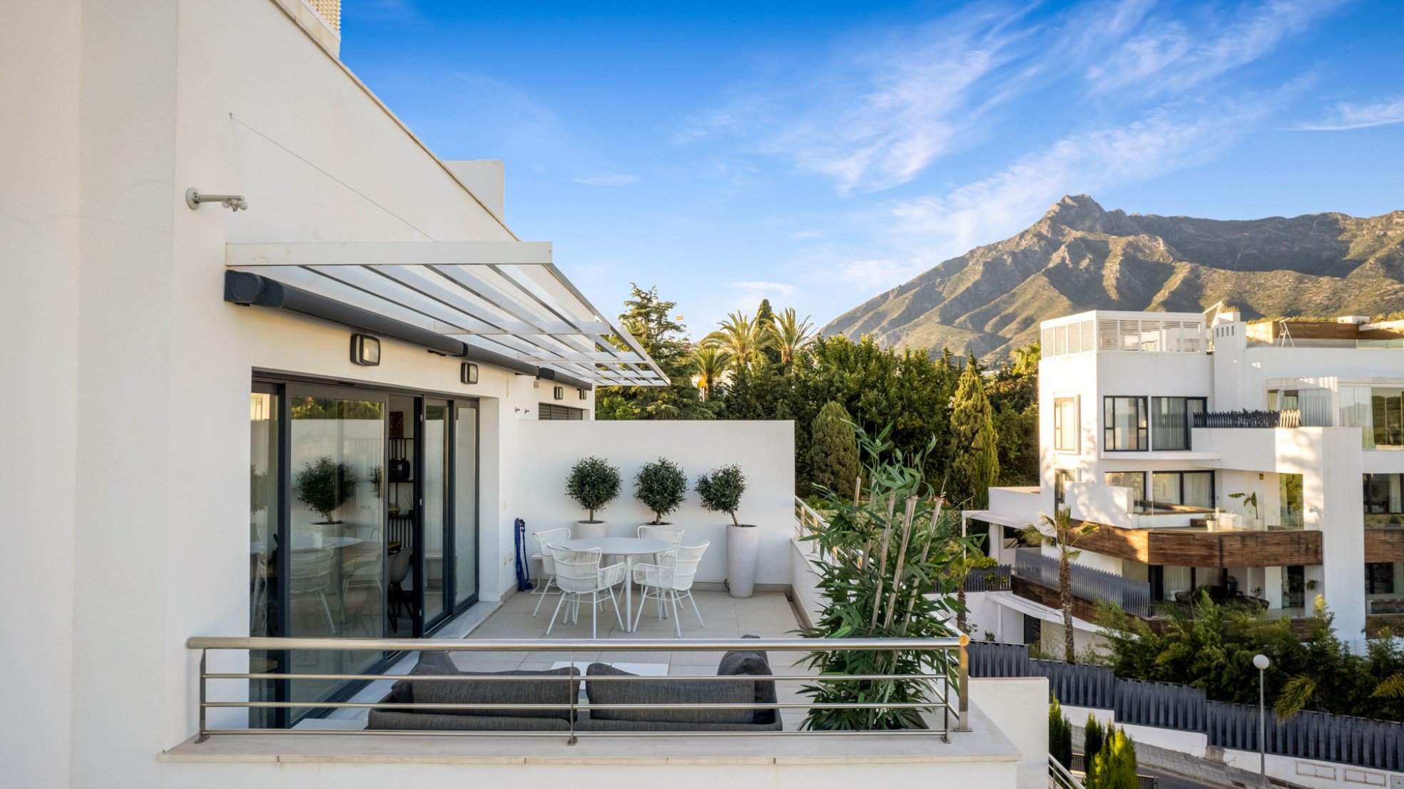 ​There are 3 full-fledged bedrooms with 3 bathrooms, all have direct access to the terraces. The property is on two levels and is located on a corner with beautiful views. The property is modern furnished and has satellite TV. There is also alarm, air conditioning cold and hot and fast internet connection. The partially covered terrace is modern furnished and has a beautiful view of the garden and the famous mountain of Marbella, La Concha.
