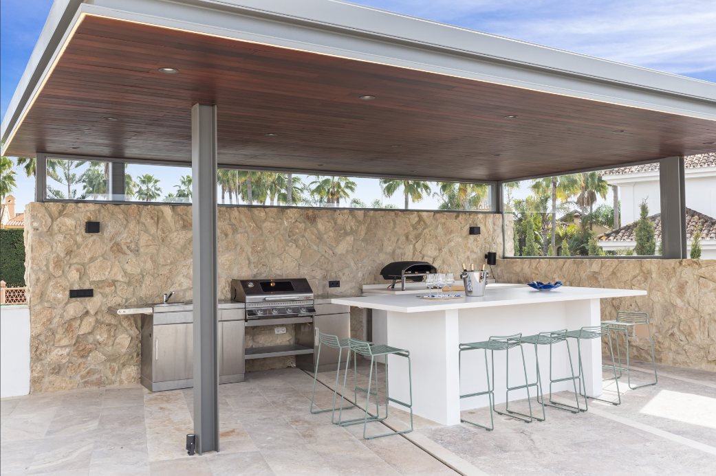 Outside, the villa’s garden is a true highlight. The overflow infinity pool creates a beautiful, tranquil setting where you can cool off or relax by the water with a good book. A fantastic new outdoor kitchen and Bbq area is being constructed, paired with a seating area—perfect for hosting meals with family or friends. At night, the villa comes alive with light projections that add a unique and cool atmosphere.